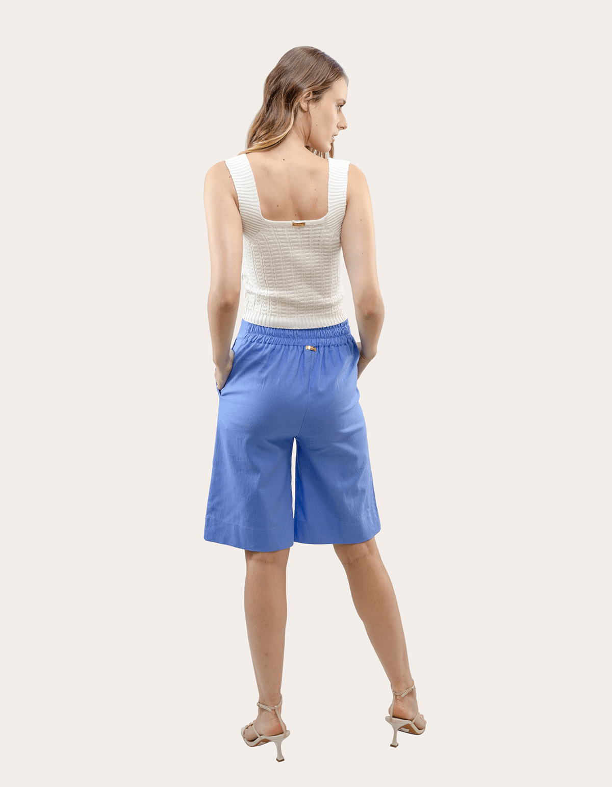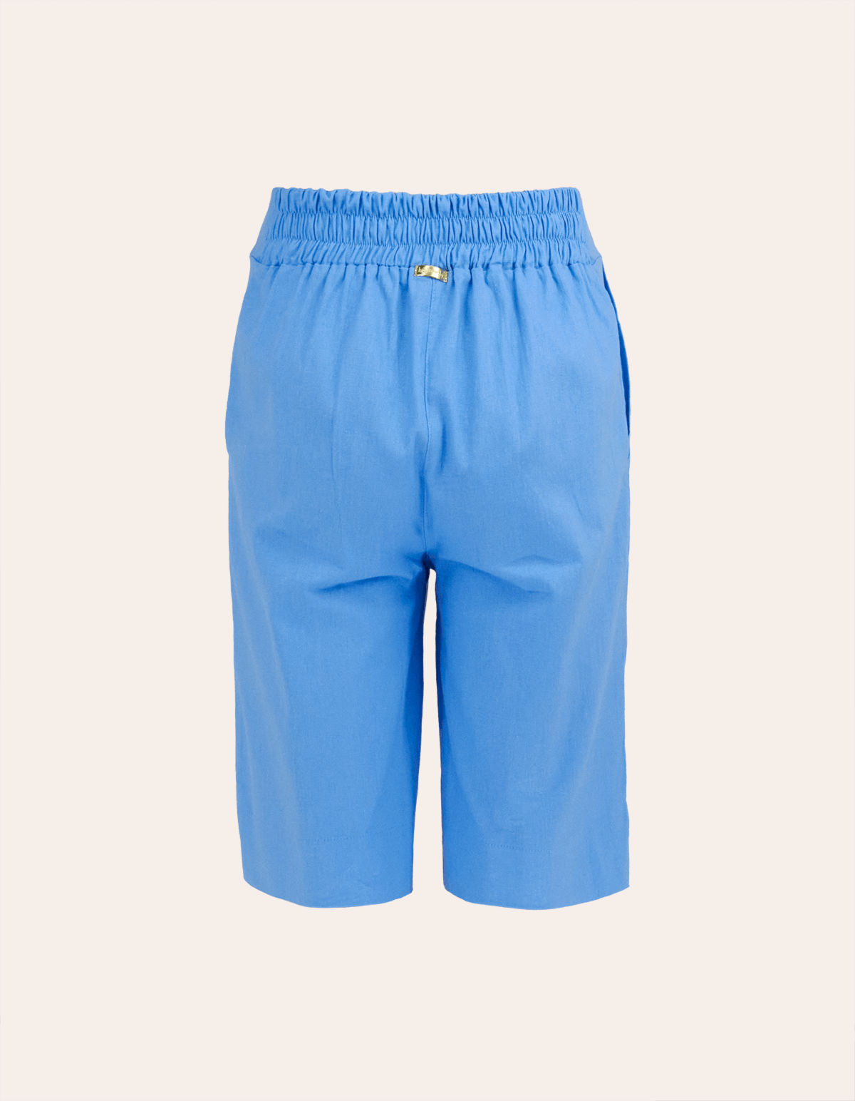 Bermuda confeccionada em tecido plano com linho. possui caimento reto mais soltinho, cós com elástico posterior e cintura alta, possui dois bolsos frontais e botão decorativo na frente. ideal para ocasiões especiais! combine com sandálias e acessórios.