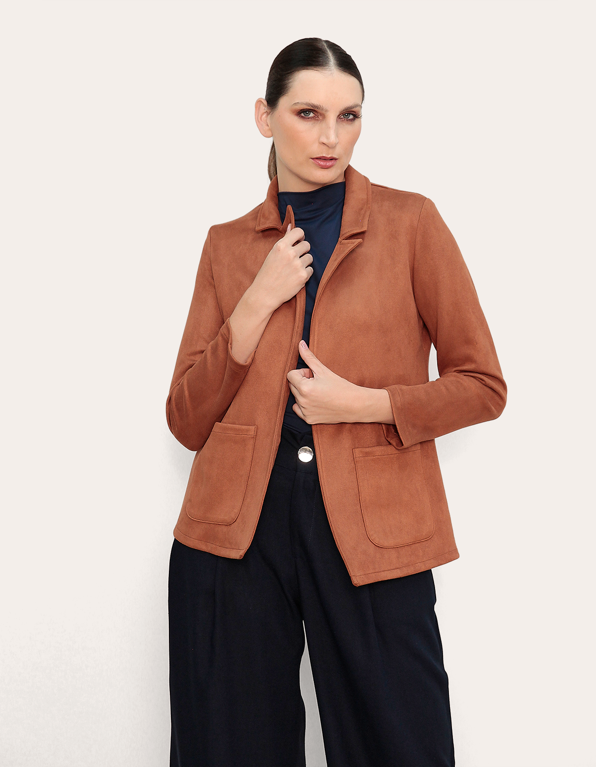 • Modelagem: Blazer aberto, com gola clássica e caimento fluido.