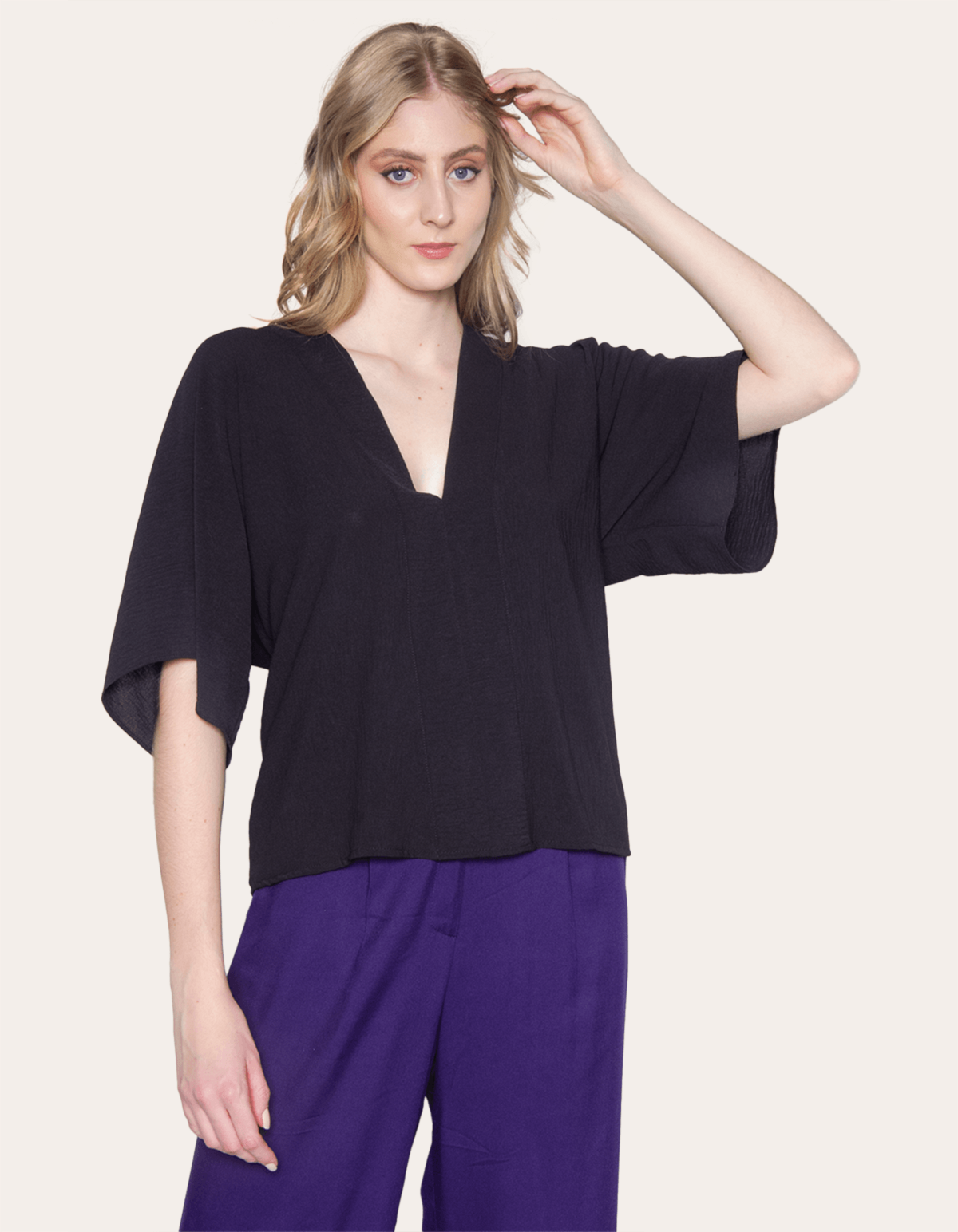Apresentamos uma blusa de manga curta no estilo morcego, com uma modelagem ampla que proporciona conforto e estilo. essa peça traz uma abordagem moderna e descontraída para o seu guarda-roupa. a manga curta morcego acrescenta um toque de elegância e fluidez ao visual, enquanto o decote em v valoriza o colo de maneira sutil e sofisticada. além disso, a amarração na parte de trás adiciona um detalhe charmoso, criando um efeito único ao ajustar a blusa de acordo com sua preferência. perfeita para criar looks versáteis, essa blusa é uma escolha elegante e contemporânea para diversas ocasiões.