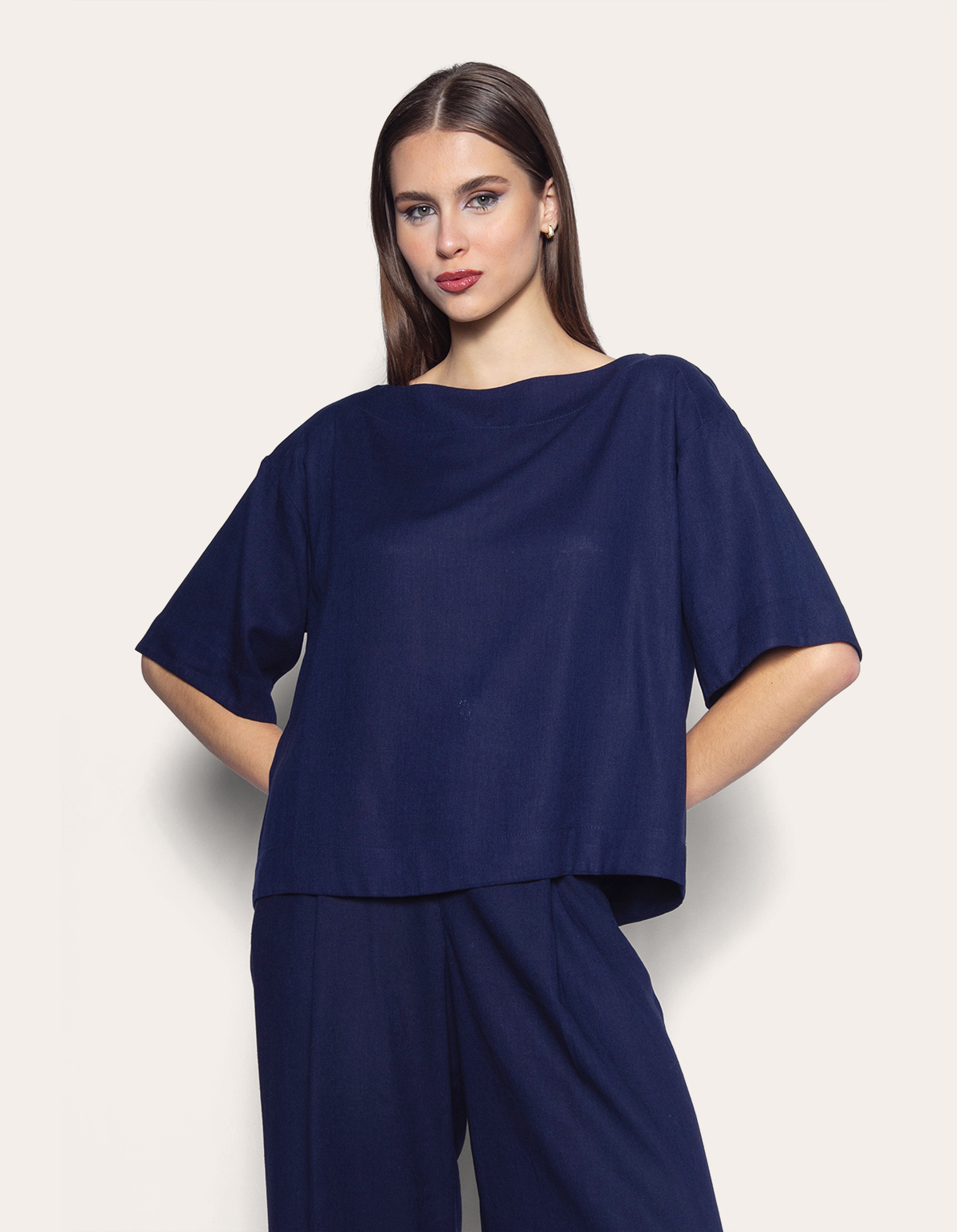 Blusa manga 7/8, decote reto, modelagem ampla, tipo bata. é ideal para quem valoriza peças leves, soltas e fluidas. seu design traduz simplicidade refinada, com linhas retas que transmitem leveza e sofisticação atemporal, tornando-se perfeita para o estilo de vida dinâmico e contemporâneo da mulher moderna.