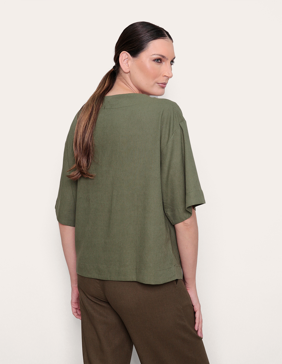 Blusa manga 7/8, decote reto, modelagem ampla, tipo bata. é ideal para quem valoriza peças leves, soltas e fluidas. seu design traduz simplicidade refinada, com linhas retas que transmitem leveza e sofisticação atemporal, tornando-se perfeita para o estilo de vida dinâmico e contemporâneo da mulher moderna.