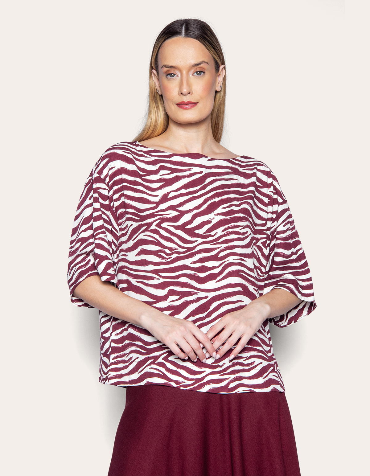 Blusa manga 7/8, decote reto, modelagem ampla, tipo bata. É ideal para quem valoriza peças leves, soltas e fluidas. Seu design traduz simplicidade refinada, com linhas retas que transmitem leveza e sofisticação atemporal, tornando-se perfeita para o estilo de vida dinâmico e contemporâneo da mulher moderna.