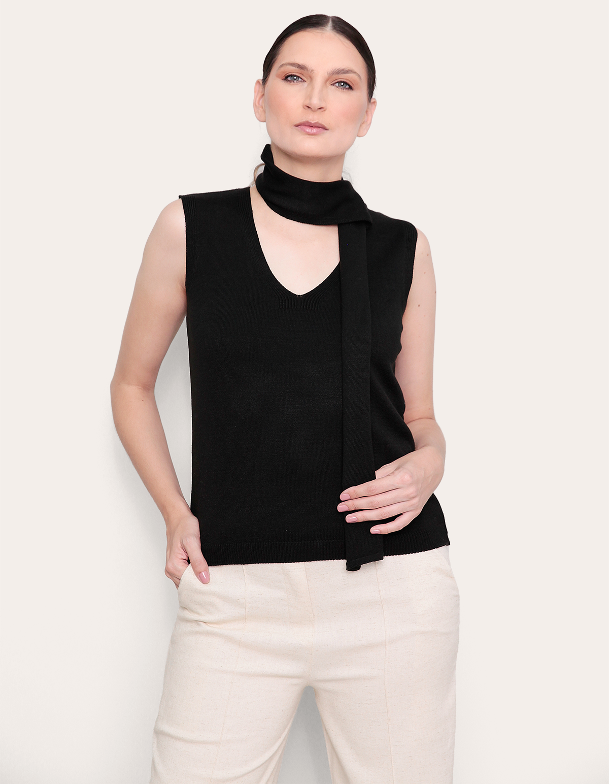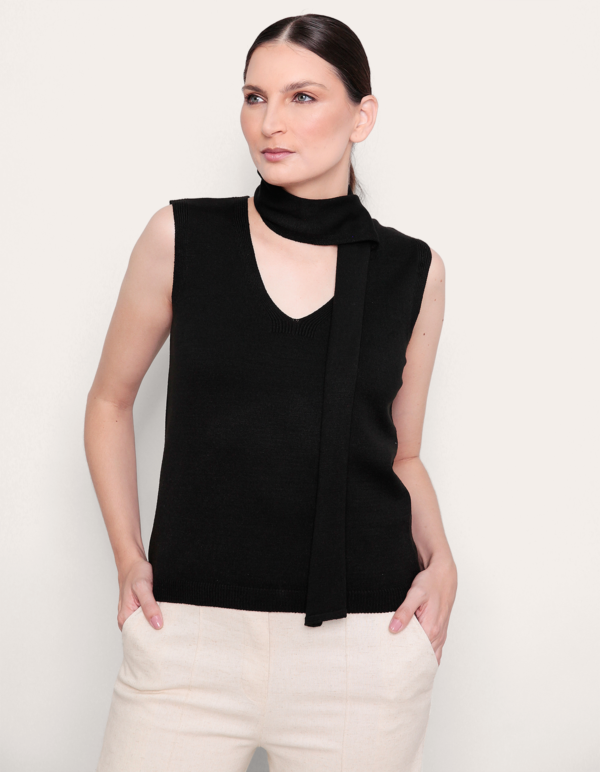 Blusa tricot cavada com cachecol fixo a gola. esta peça não só proporciona o máximo conforto, mas também adiciona um toque de elegância e praticidade ao seu guarda-roupa.
