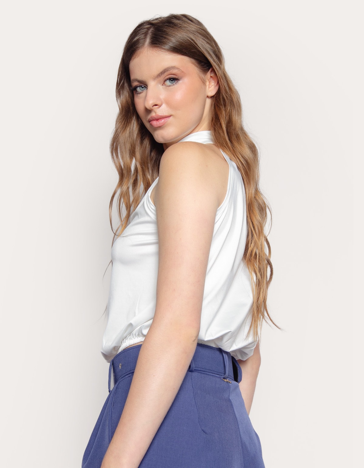 Blusa gola alta estilo nadador com a parte da frente solta e drapeada caindo de forma fluída sobre o busto. Possui um elástico na barra, franzindo na cintura e criando um efeito bufante. De estilo elegante e casual pode ser usada para um look de festa dependendo dos acessórios.