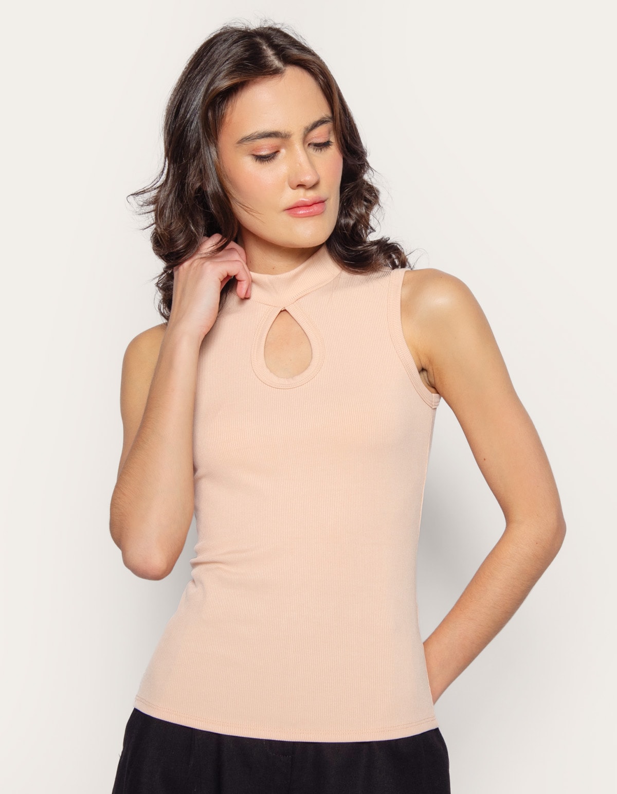 Blusa cavada, confeccionada em malha canelada. possui golinha média e caimento ajustado ao corpo.