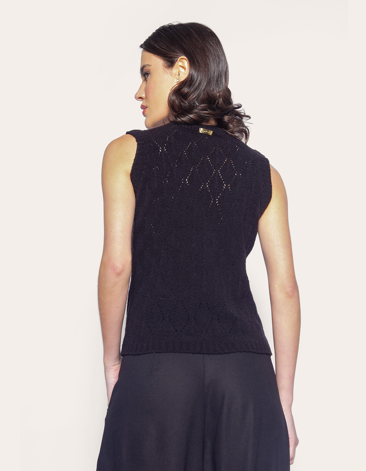 Blusa cavada tricot ponto vazado. Esta blusa é uma peça delicada e cheia de estilo, ideal para quem busca uma combinação de textura e elegância em seus looks.