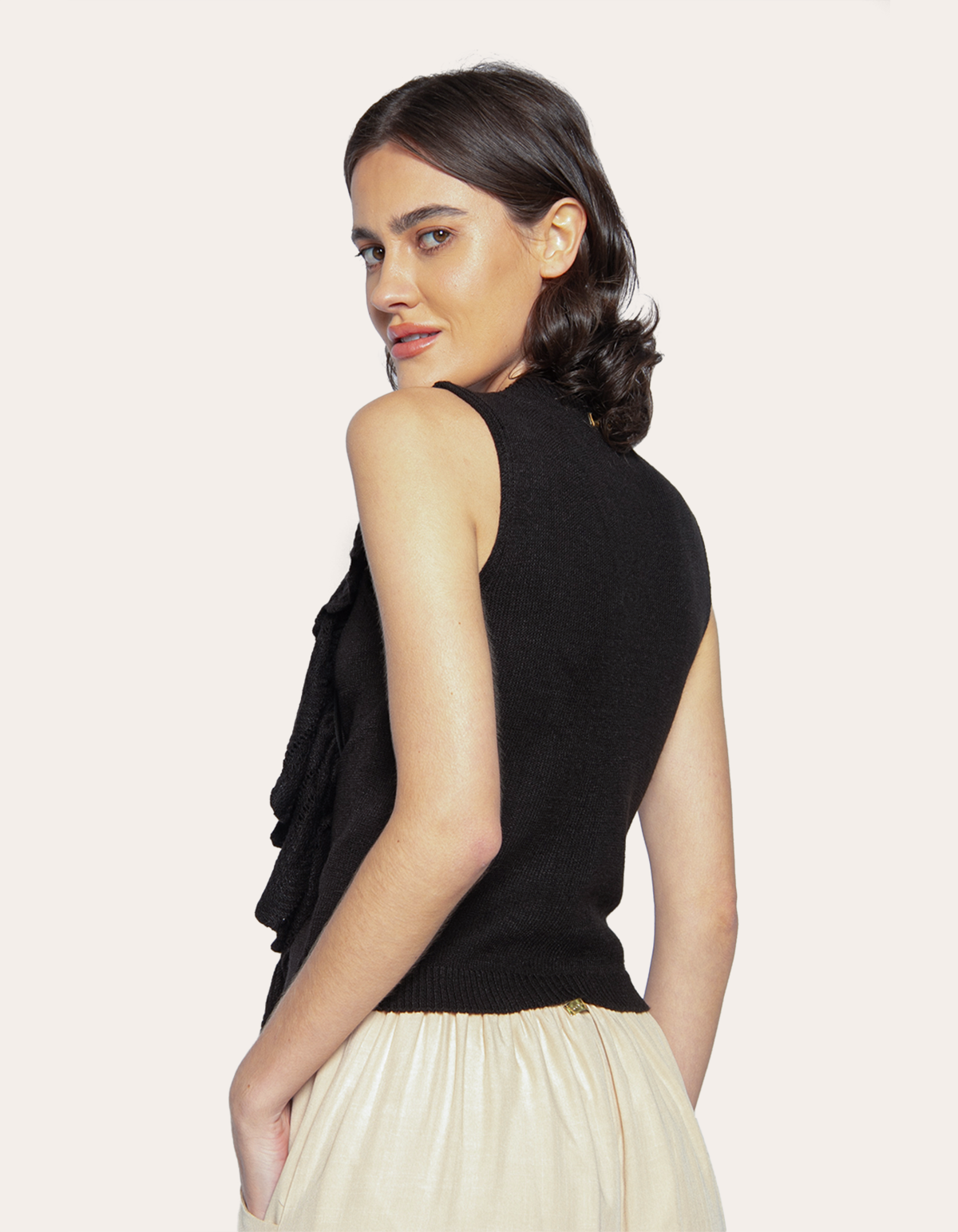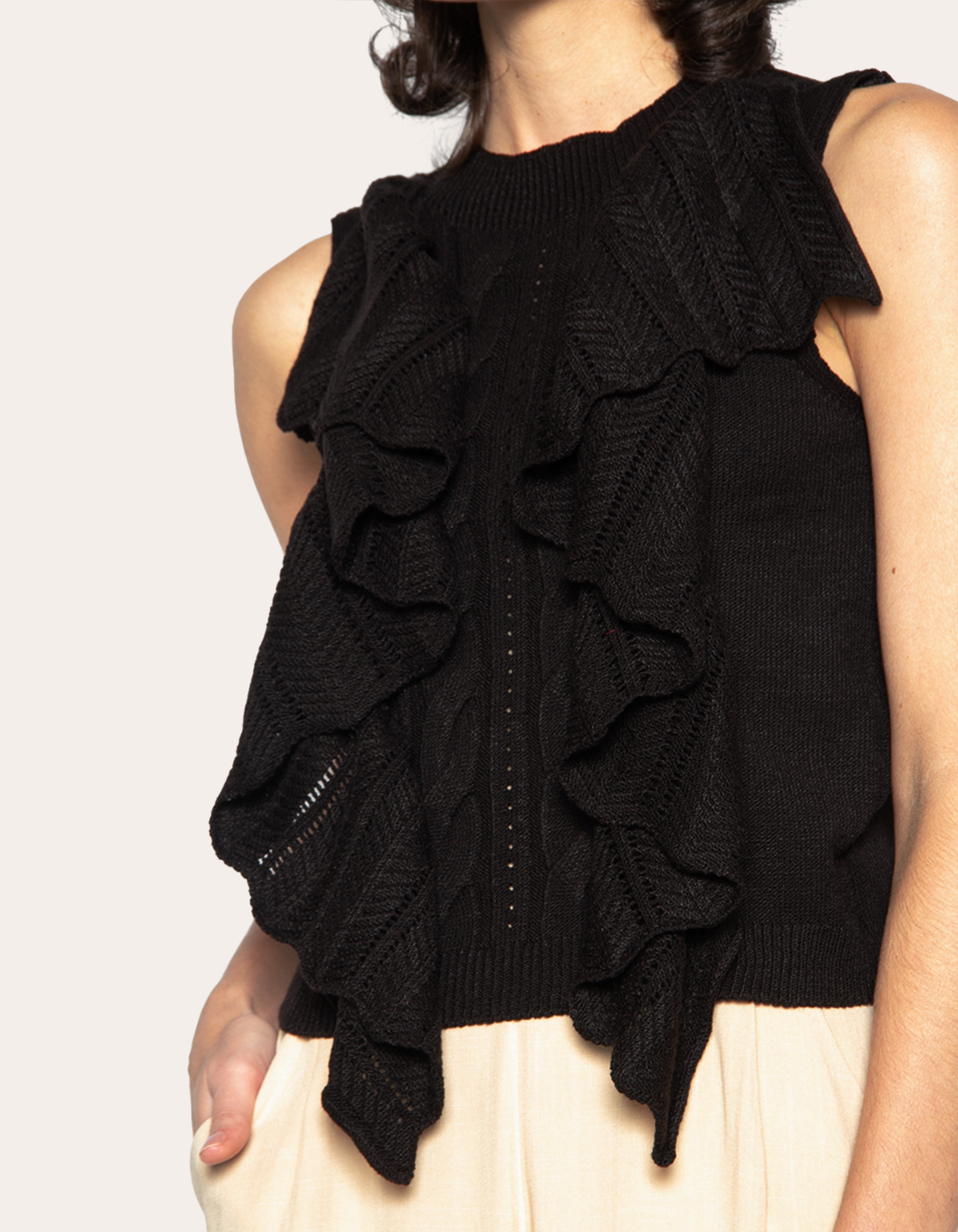 Blusa cavada tricot, detalhe babado nas laterais. combine com uma calça jeans de cintura alta e tênis para um look casual e moderno. para um visual mais elegante, experimente com uma saia midi e um salto alto. aposte em acessórios que complementem o look, como brincos e colares delicados.