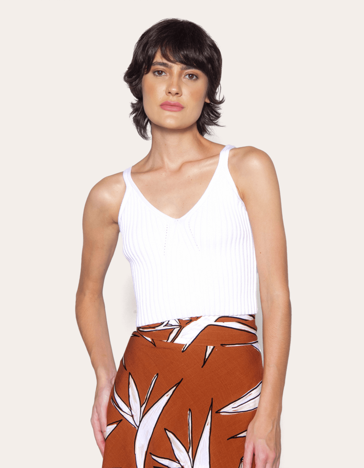 Blusa cropped alcinha confeccionado em tricot canelado. uma ótima opção para usar com calças e saias cintura alta mantendo o equilíbrio e para fazer composições mais delicadas e cool.