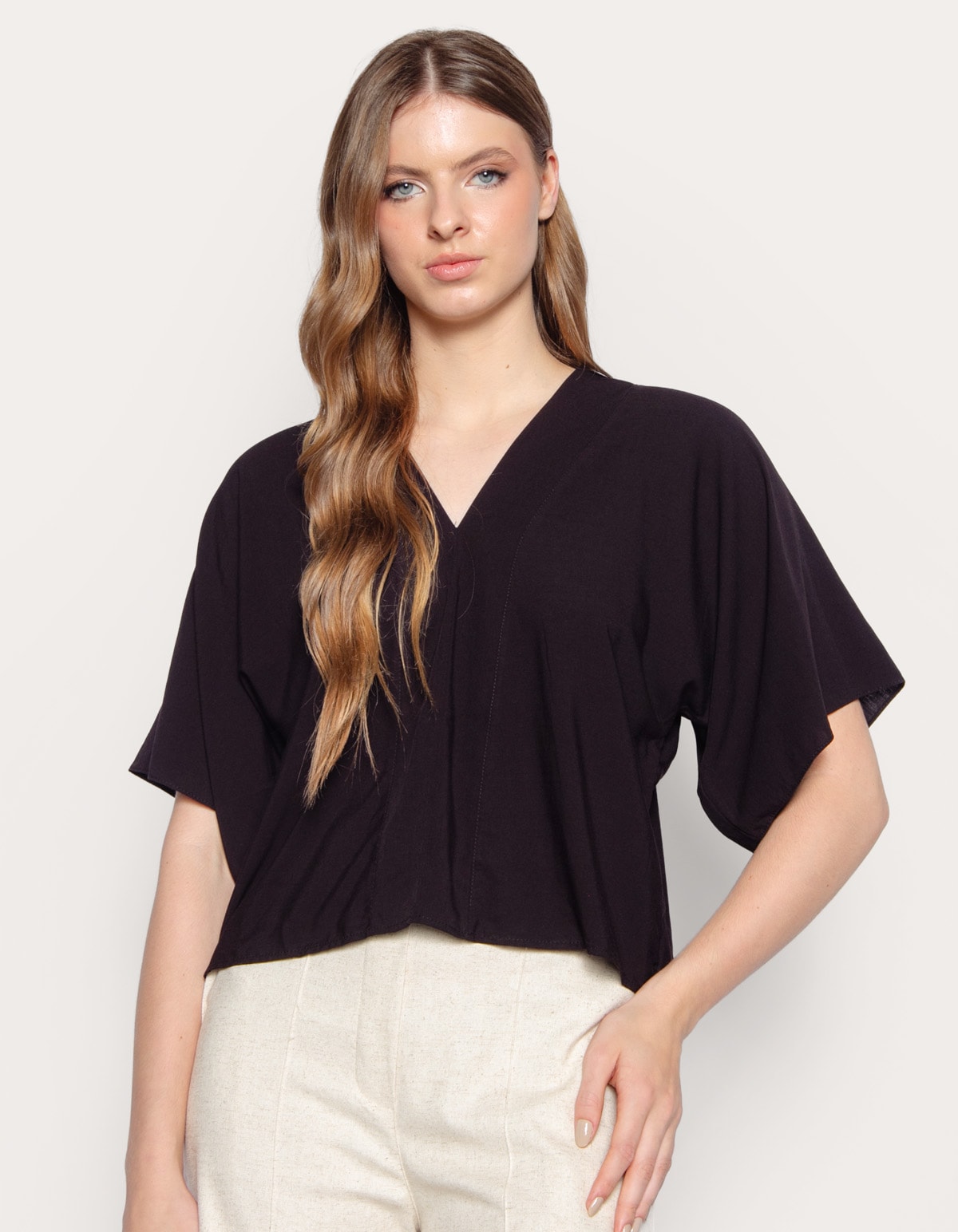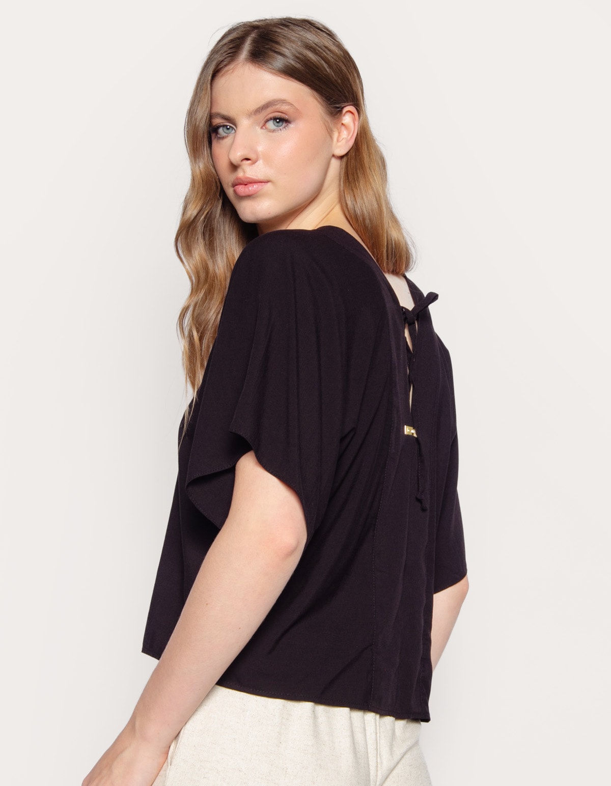 Blusa manga curta ampla no estilo morcego que são mais soltas na cava e no braço, decote v, com recortes verticais no centro (frente) que ajudam a dar forma e estrutura à blusa. Nas costas o decote v também é destaque e há duas tiras do mesmo tecido que se amarram na altura da nuca, formando um laço. Com caimento solto e fluido, indicando um modelo confortável e folgado ideal para climas quentes, perfeita para um look casual e descontraído.