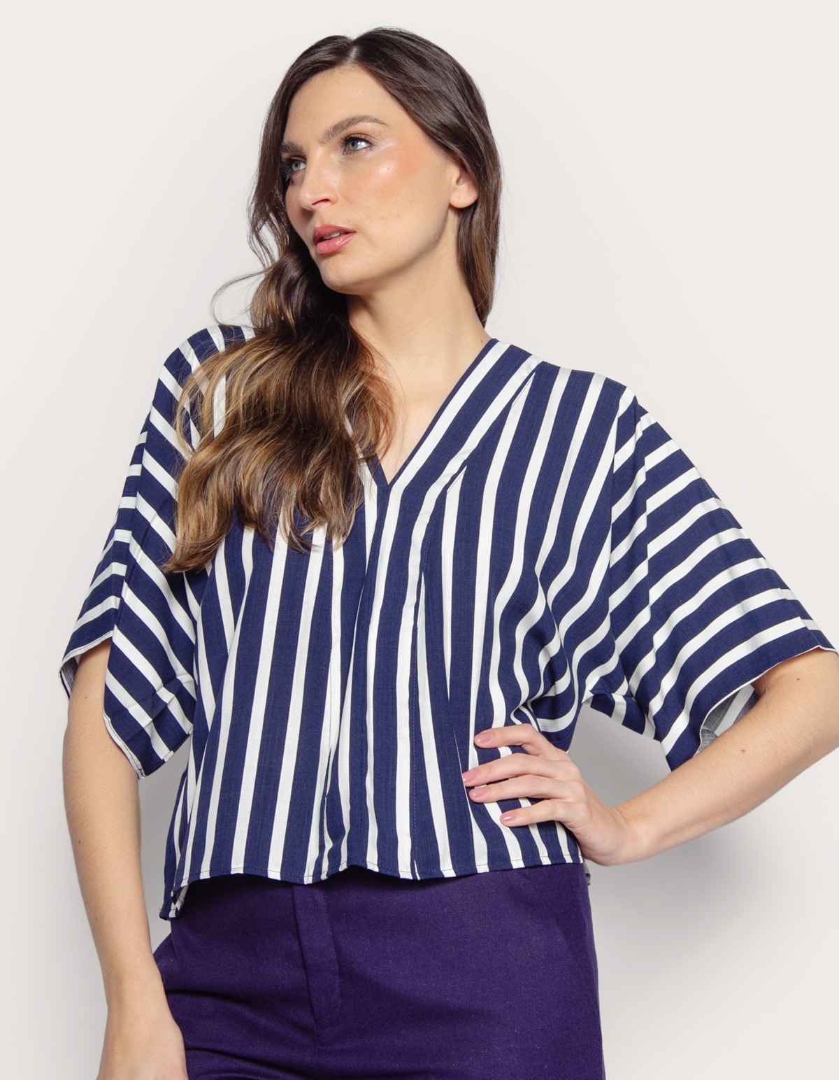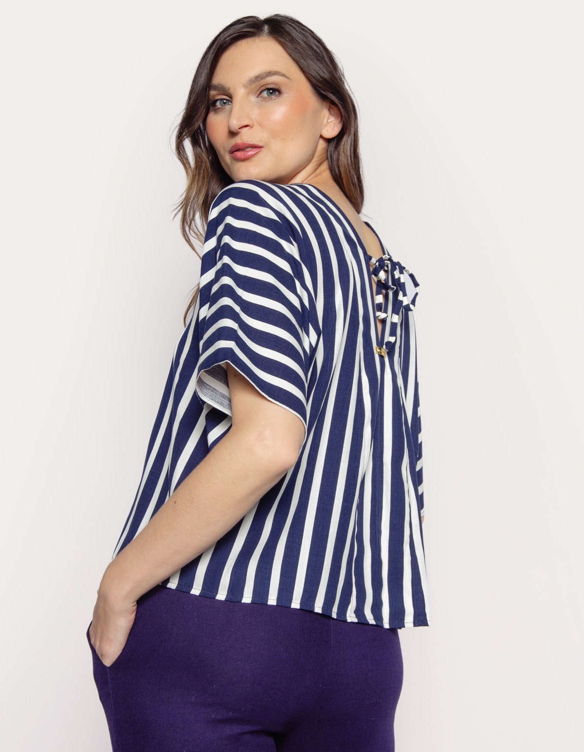 Blusa manga curta ampla no estilo morcego que são mais soltas na cava e no braço, decote v, padronagem listrada. Nas costas o decote v também é destaque e há duas tiras do mesmo tecido que se amarram na altura da nuca, formando um laço. Com caimento solto e fluido, indicando um modelo confortável e folgado ideal para climas quentes, perfeita para um look casual e descontraído.