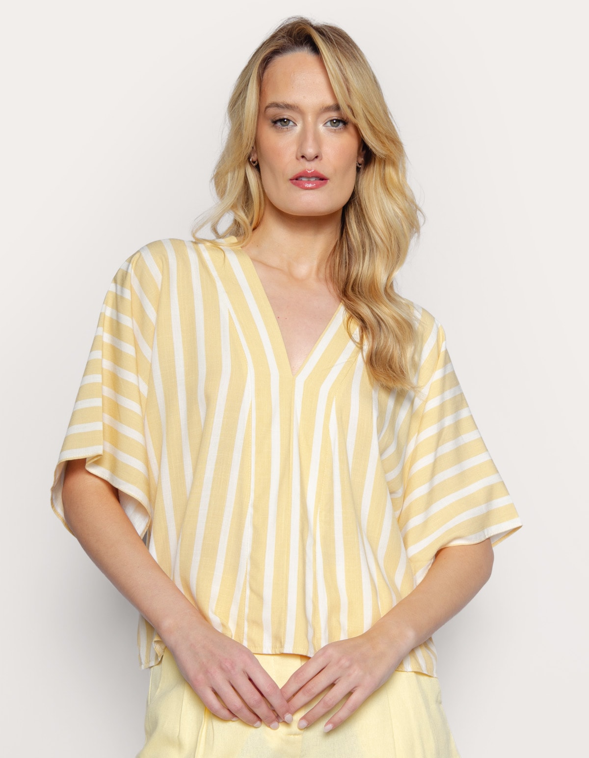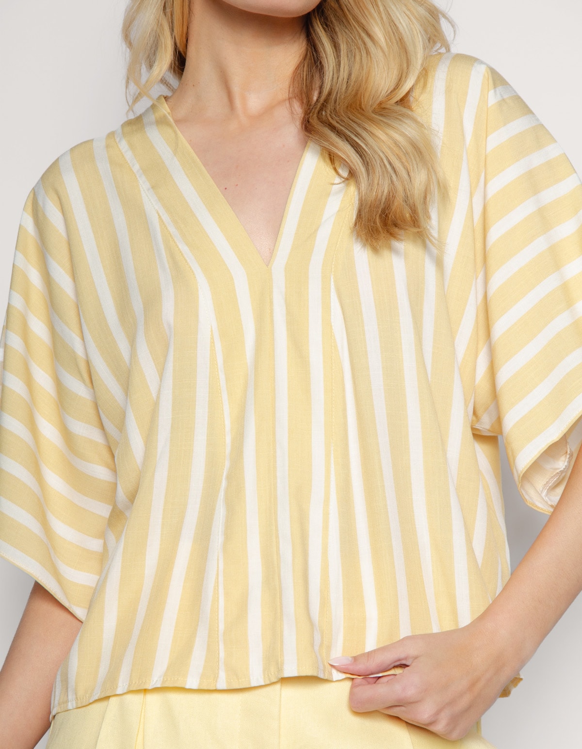 Blusa manga curta ampla no estilo morcego que são mais soltas na cava e no braço, decote v, padronagem listrada. Nas costas o decote v também é destaque e há duas tiras do mesmo tecido que se amarram na altura da nuca, formando um laço. Com caimento solto e fluido, indicando um modelo confortável e folgado ideal para climas quentes, perfeita para um look casual e descontraído.