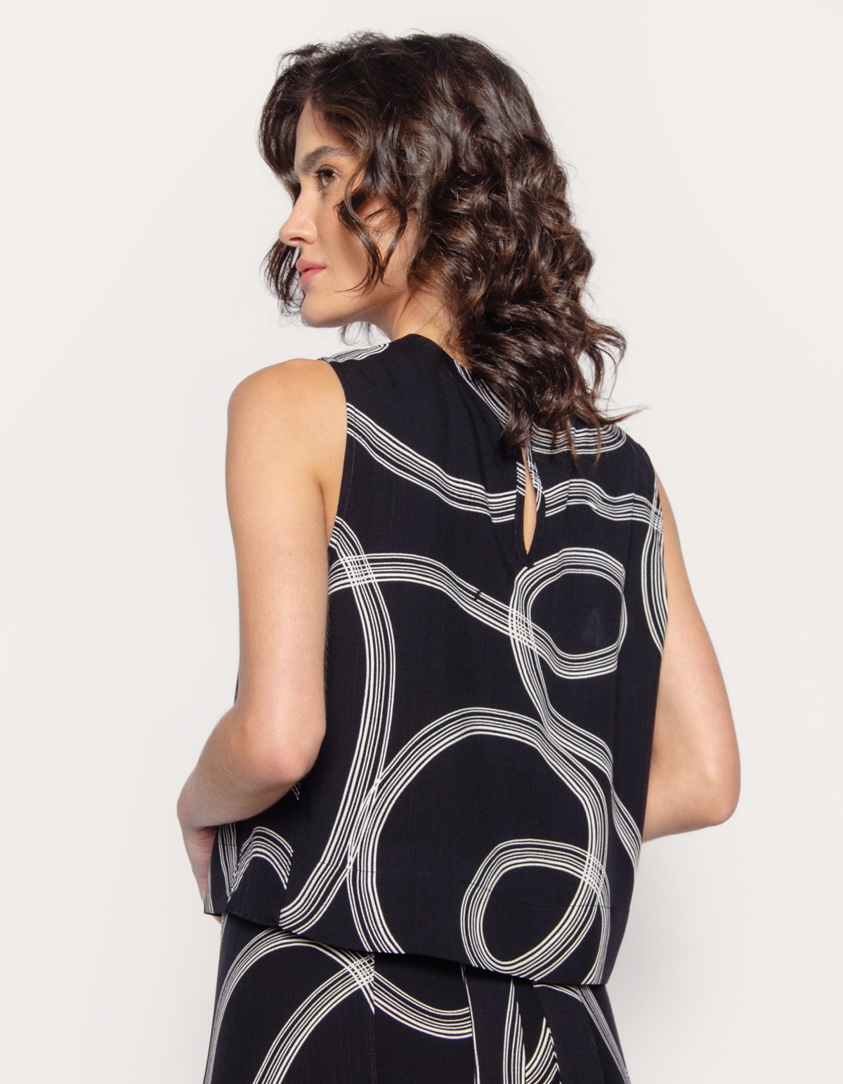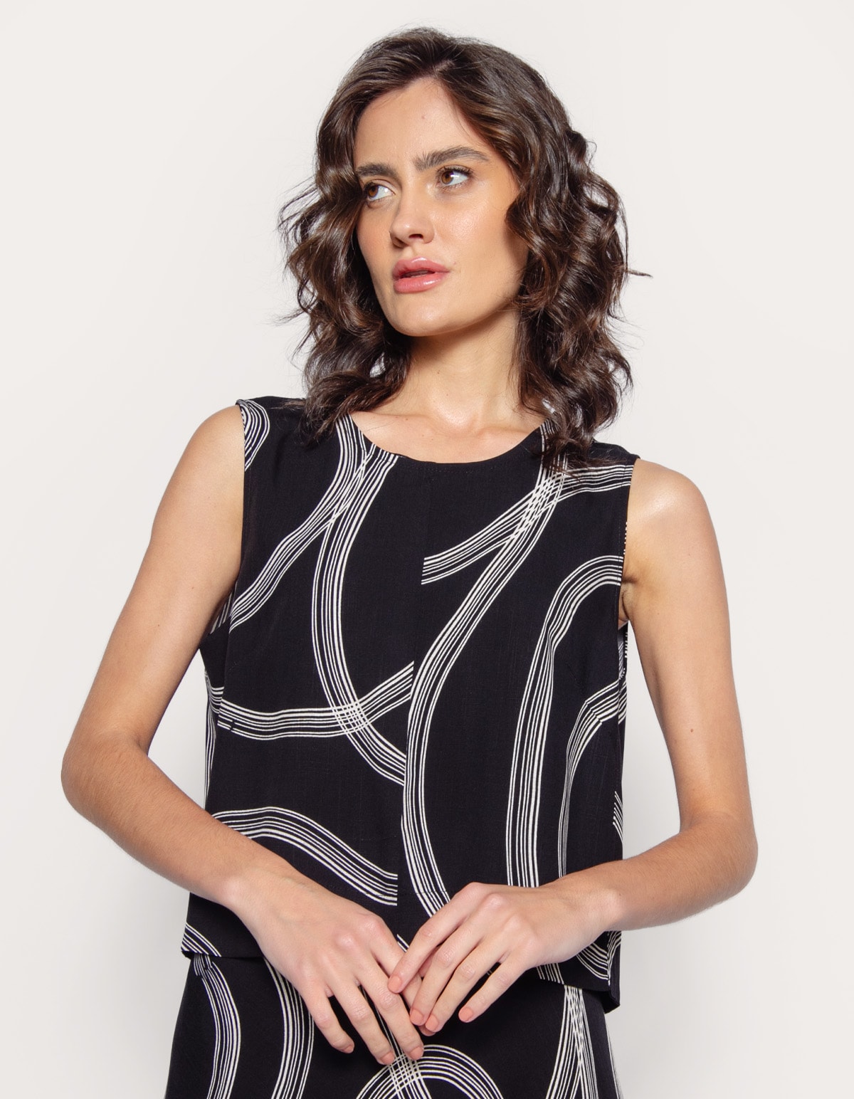 Blusa regata estampada de caimento reto. Com silhueta box (quadrada) e cropped, de caimento solto e reto no corpo. Possui decote redondo mais fechado, oferecendo cobertura e um visual mais discreto. Uma peça moderna, ideal para looks casuais e confortáveis.