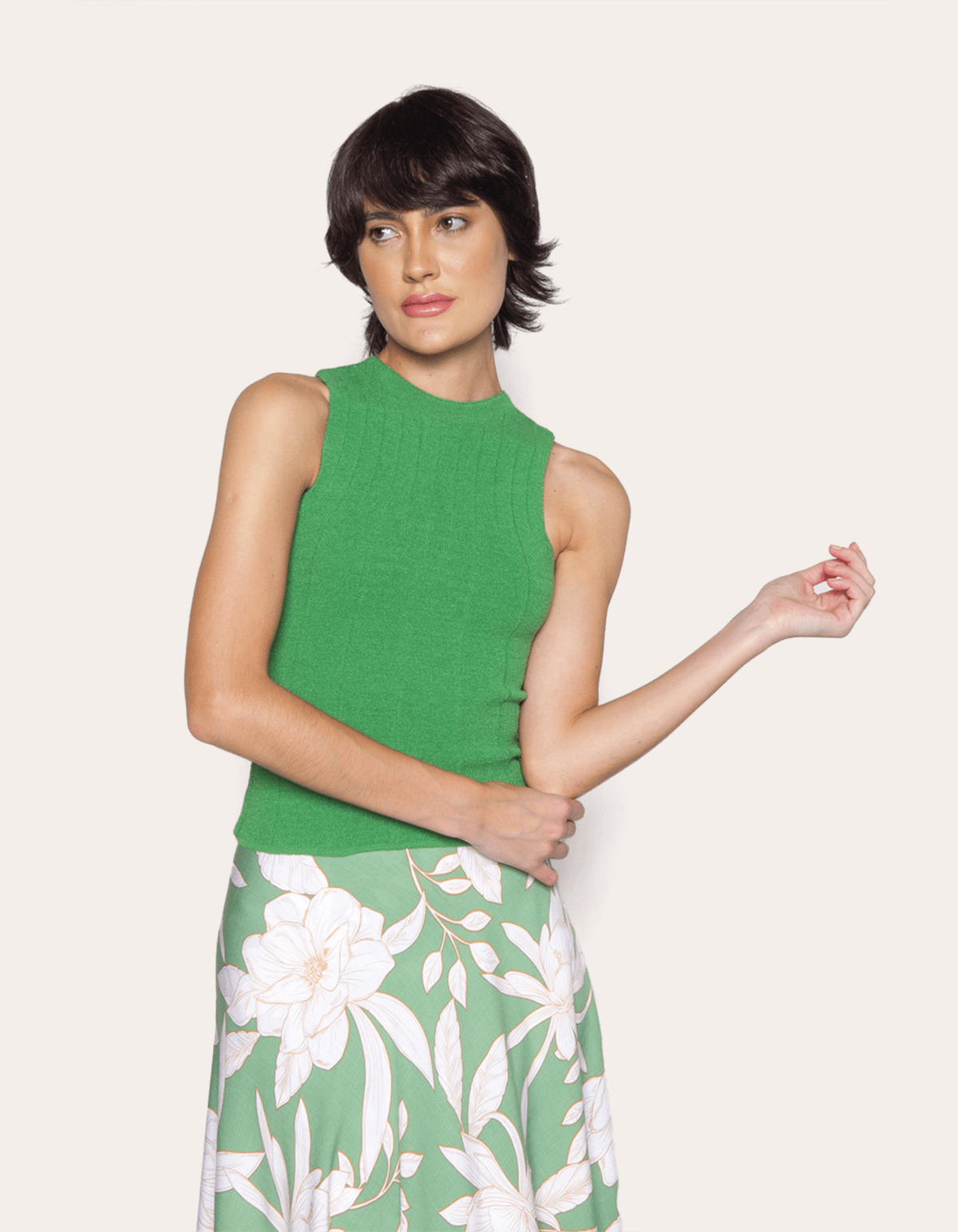 A peça confeccionada em tricot, possui gola média, é cavada, tem shape justo, caimento reto e acabamento canelado. aquele tricot básiquinho e super versátil, indispensável no guarda roupa, ideal para compor looks estilosos e muito confortáveis.