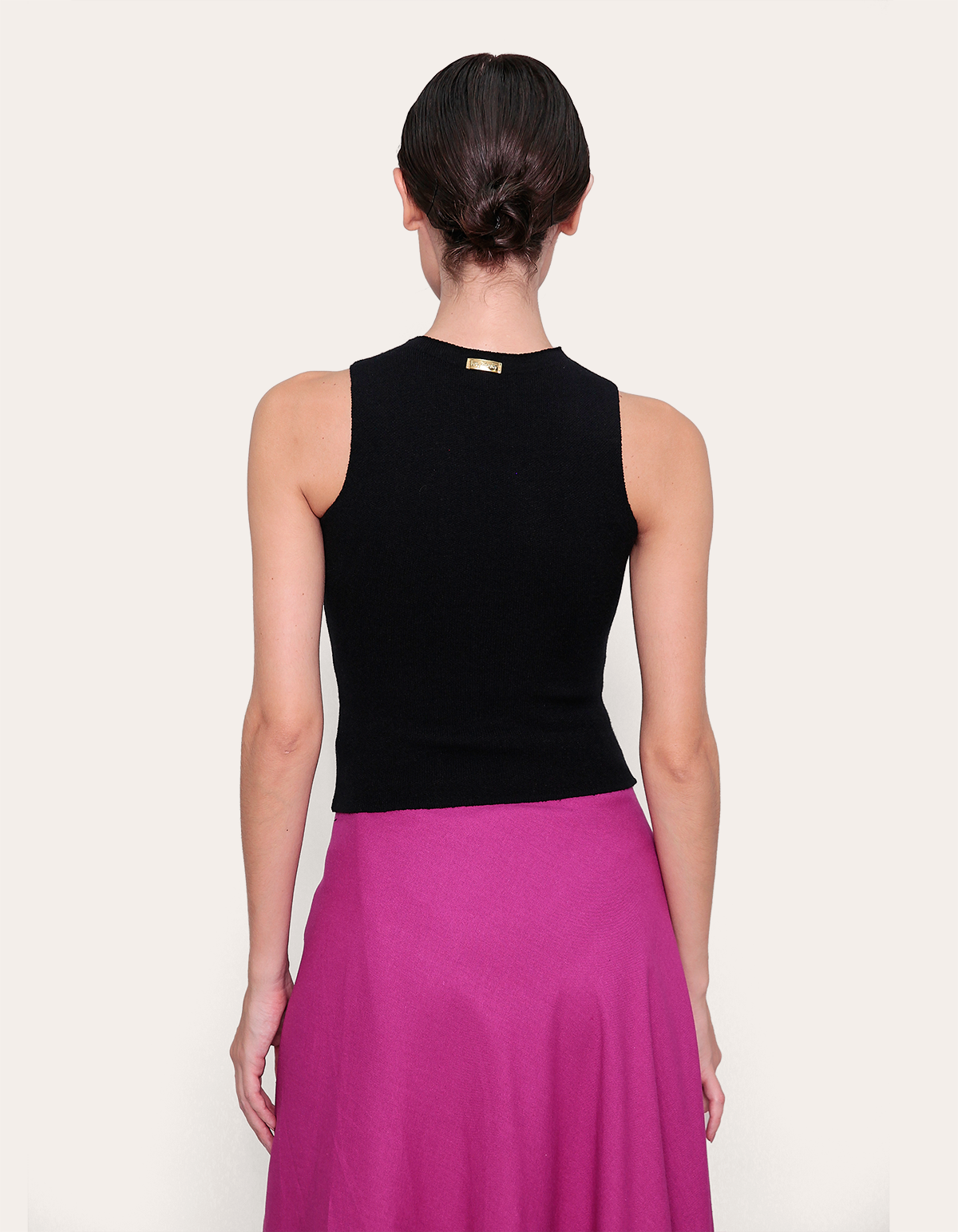Apresentamos a blusa cropped cavada com golinha em tricot, uma peça que combina gola delicada e cavas amplas para equilibrar sofisticação e descontração. com modelagem reta e caimento justo, esta blusa destaca os ombros no lugar e oferece versatilidade no vestuário. sendo a favorita do guarda-roupa, transita entre looks casuais e elaborados, expressando estilo único e autêntico.