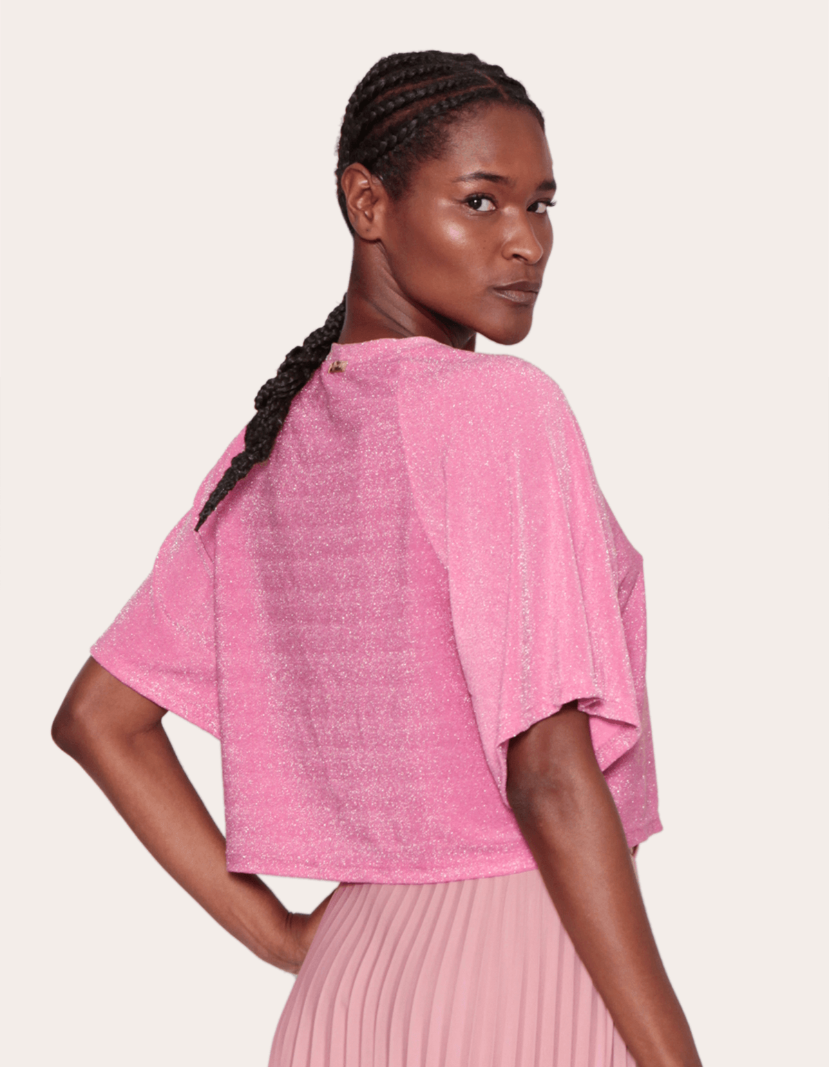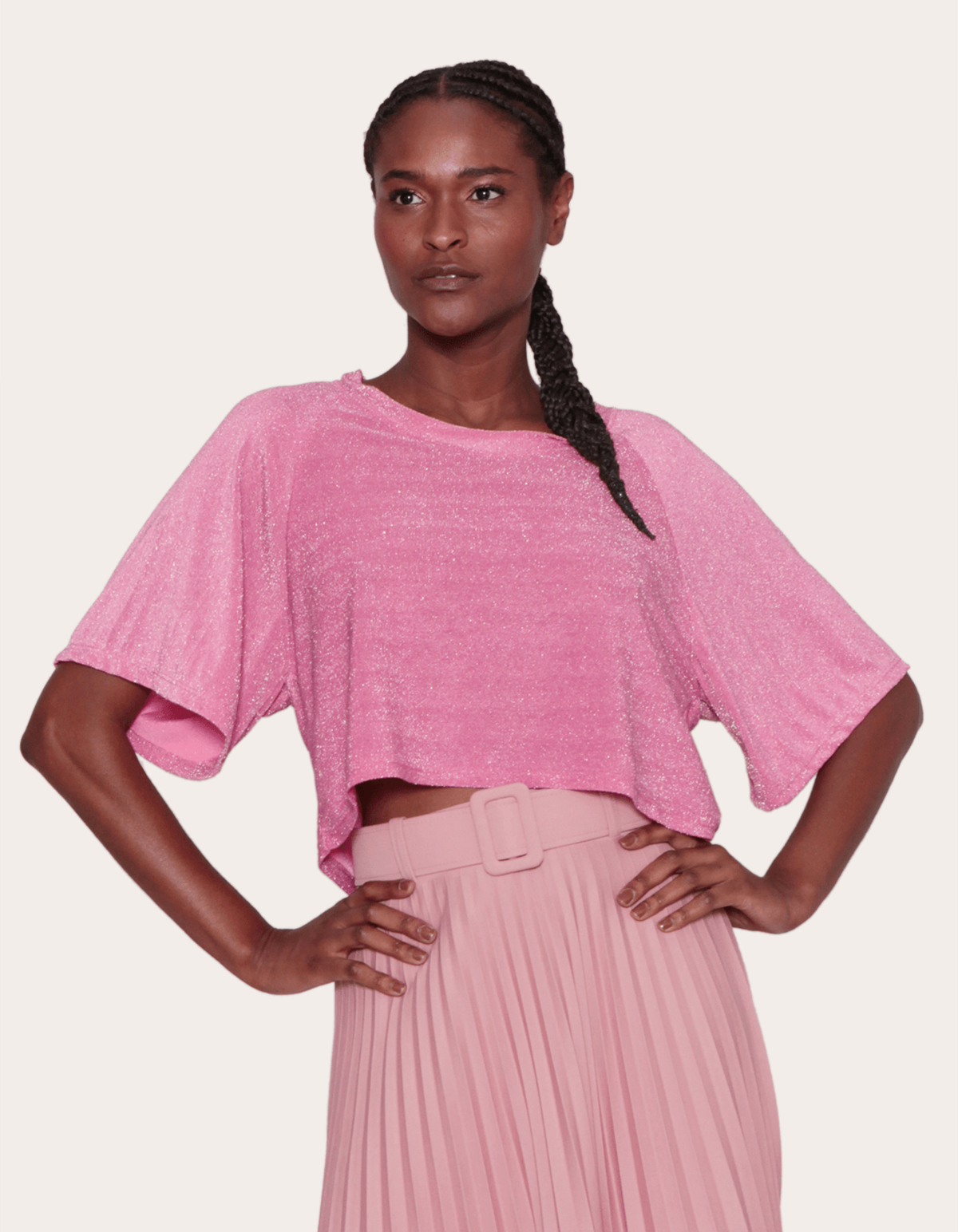 O modelo apresenta manga curta e é confeccionado com tecido em lurex, proporcionando um brilho sutil à peça. a gola é aberta e arredondada, adicionando um toque de estilo. o comprimento é intermediário, situando-se entre uma blusa padrão e um cropped, o que cria um visual equilibrado e moderno. essa peça versátil pode ser combinada com diferentes itens, oferecendo uma ampla gama de opções de looks, e é perfeita para adicionar um toque brilhante e estiloso ao seu guarda-roupa.