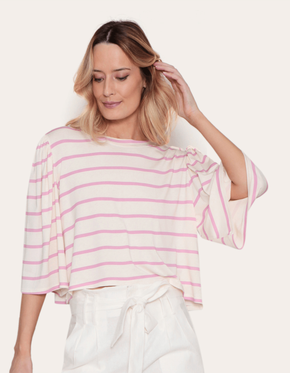 Blusa cropped de malha padronagem listrada, manga curta flare. transforme seu visual com a peça-chave perfeita! sua modelagem mais solta ao corpo proporciona conforto para combiná-la com com shorts de cintura alta ou calça wide leg. leveza e estilo para os dias de verão!