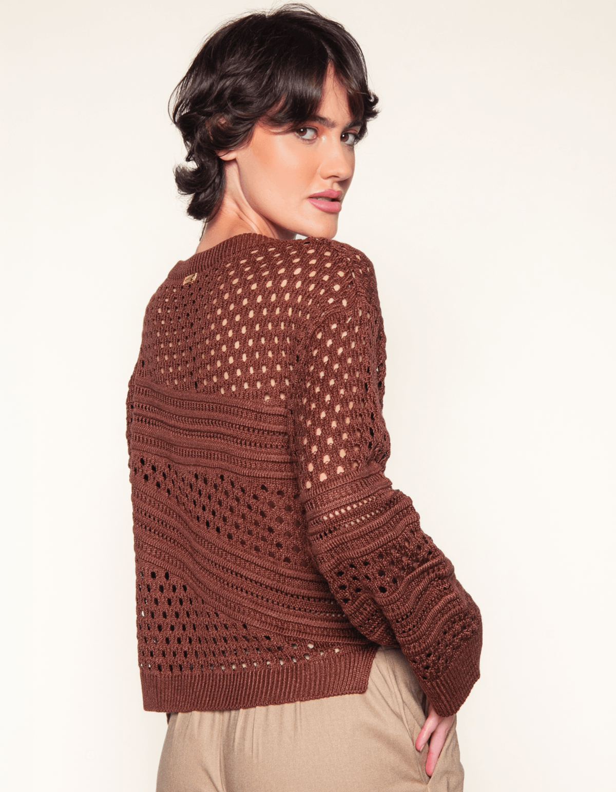 A peça tem padronagem vazada que conferem transparência. a gola é redonda, as mangas longas e ambas as extremidades tem o acabamento canelado. peça super trendy com vazados modernos, perfeita para compor com as mais diversas peças.