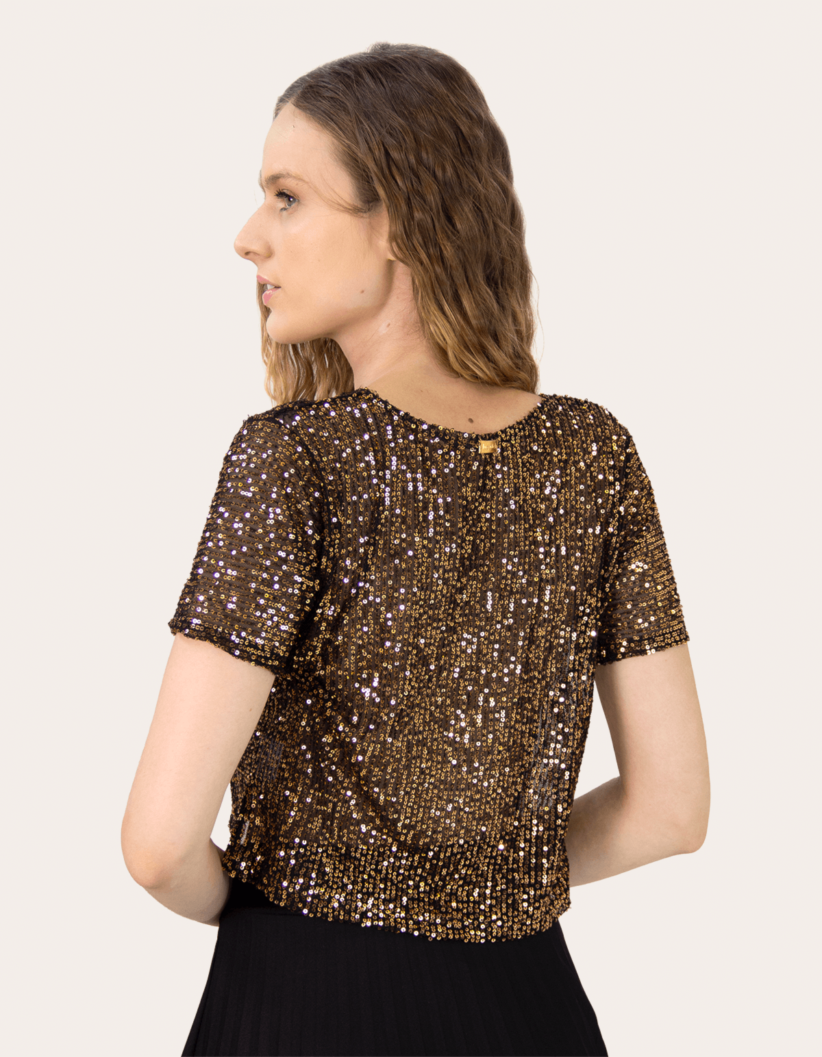 Blusa em paetê de comprimento cropped, com mangas curtas, gola arredondada shape solto. para turbinar seus looks com cor e brilho.