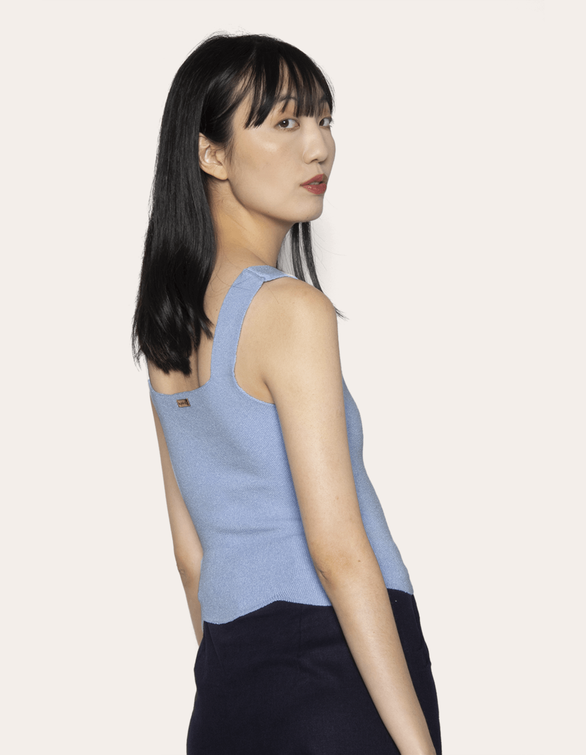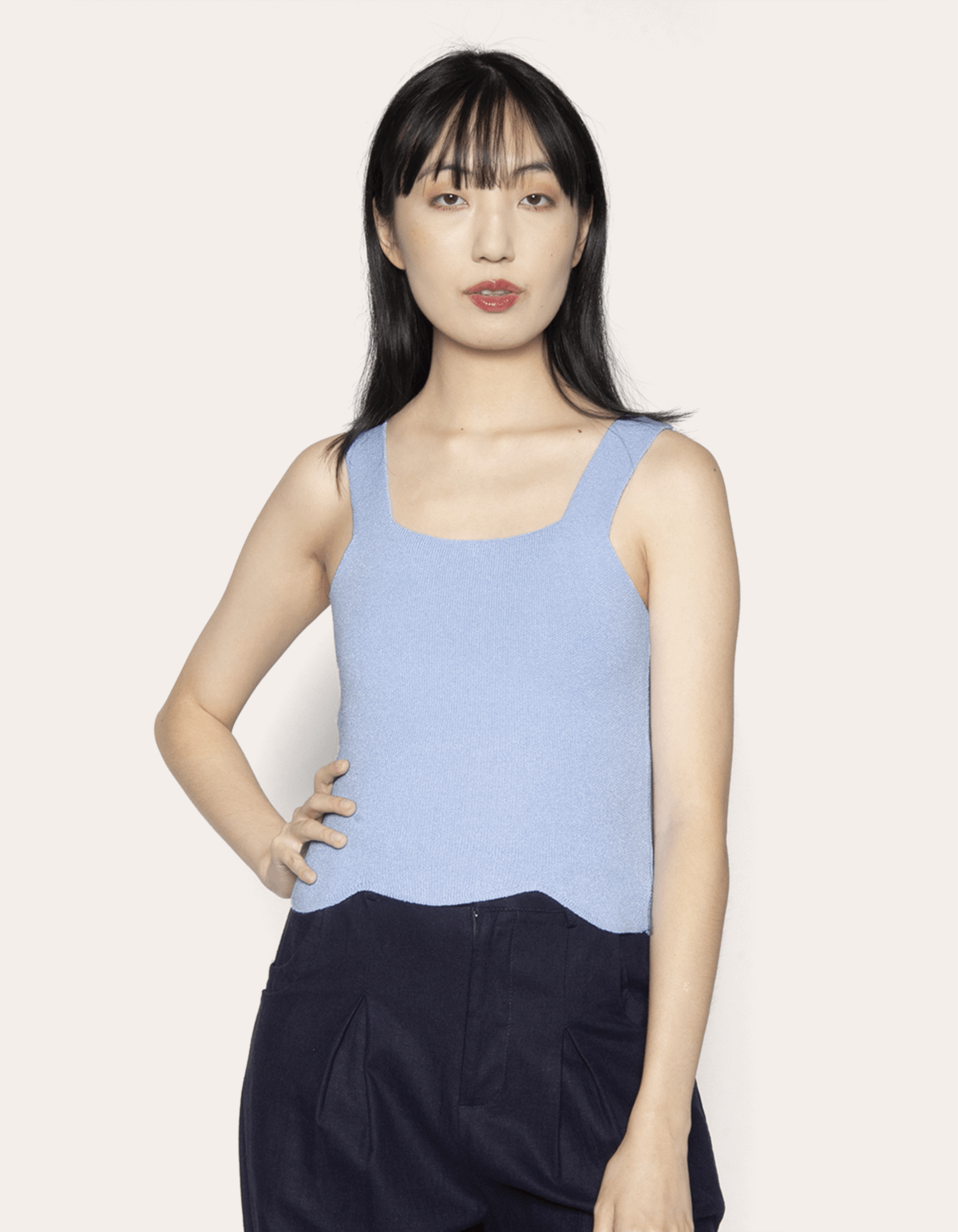 Blusa cropped tricot, decote reto, alças largas e barra com recortes nuvem. peça super em alta,versátil de usar e perfeita para fazer várias composições.
