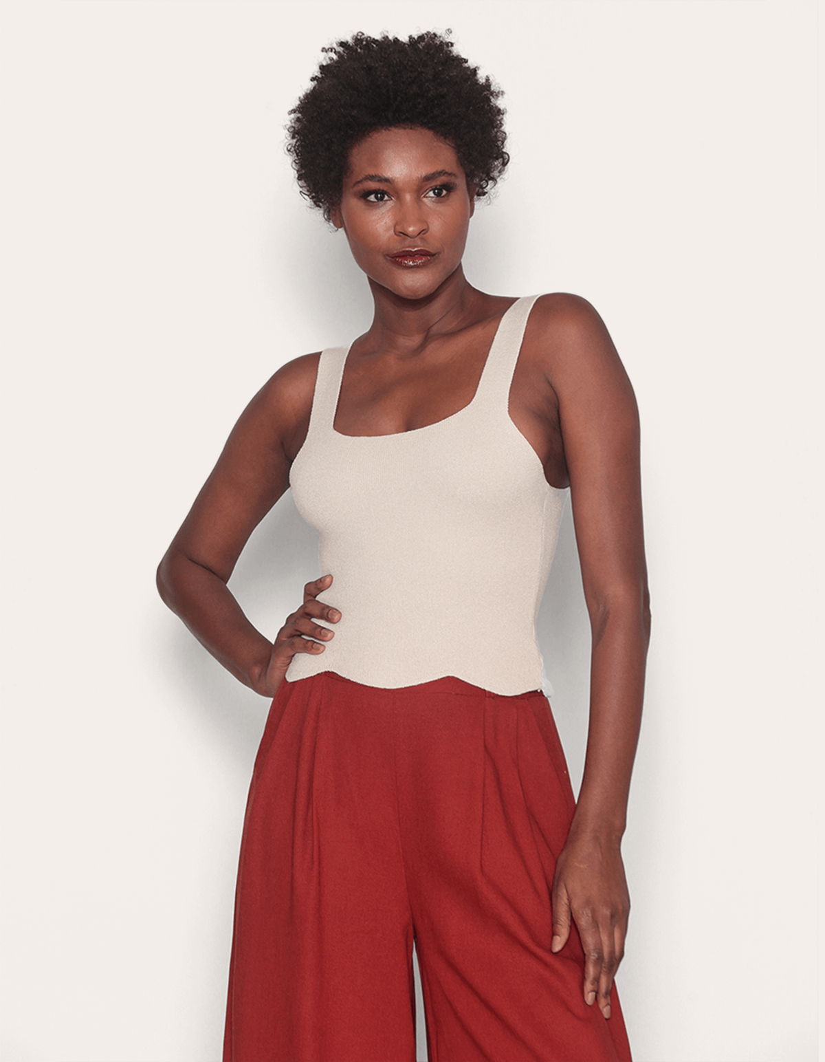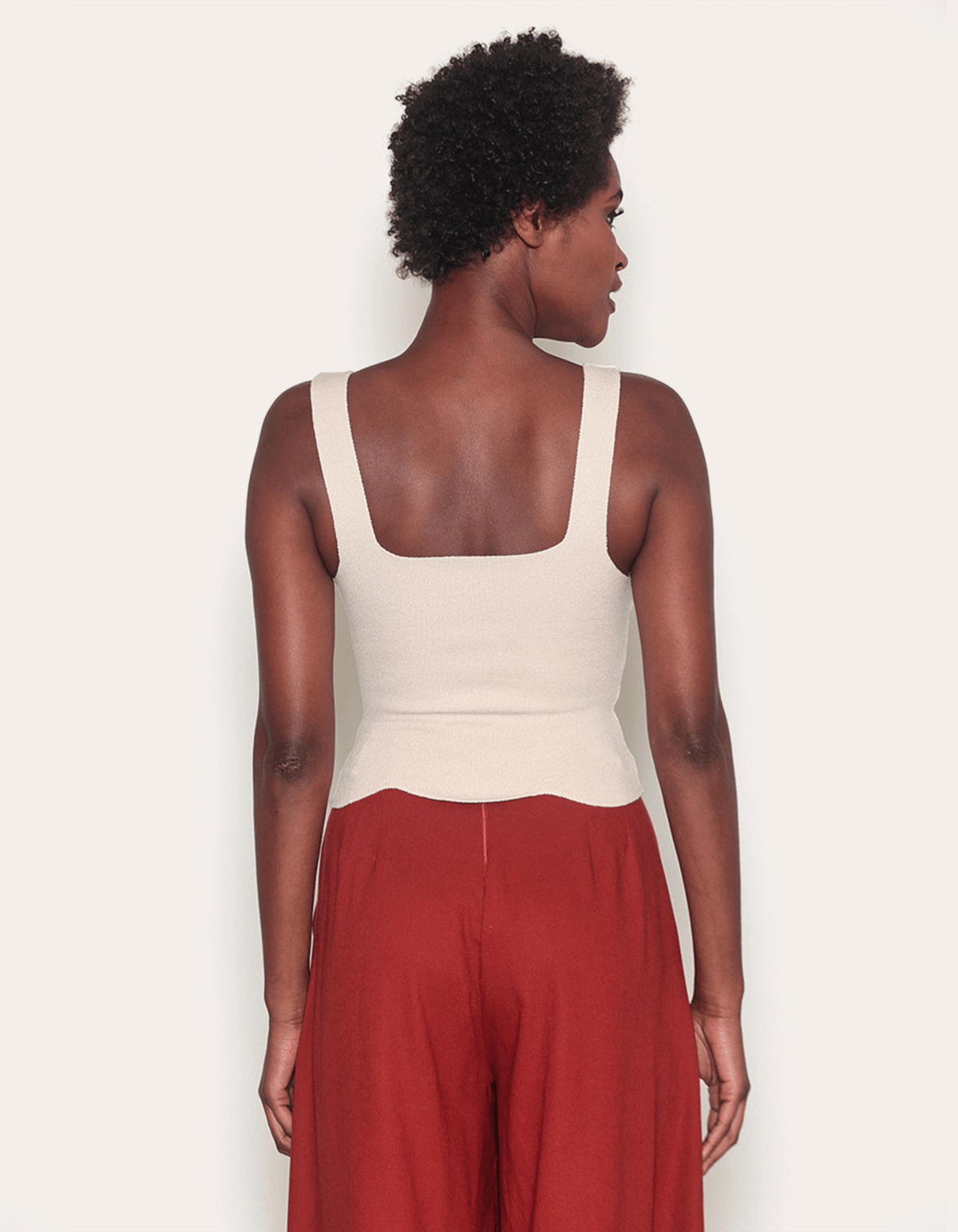 Blusa cropped tricot, decote reto, alças largas e barra com recortes nuvem. peça super em alta,versátil de usar e perfeita para fazer várias composições.