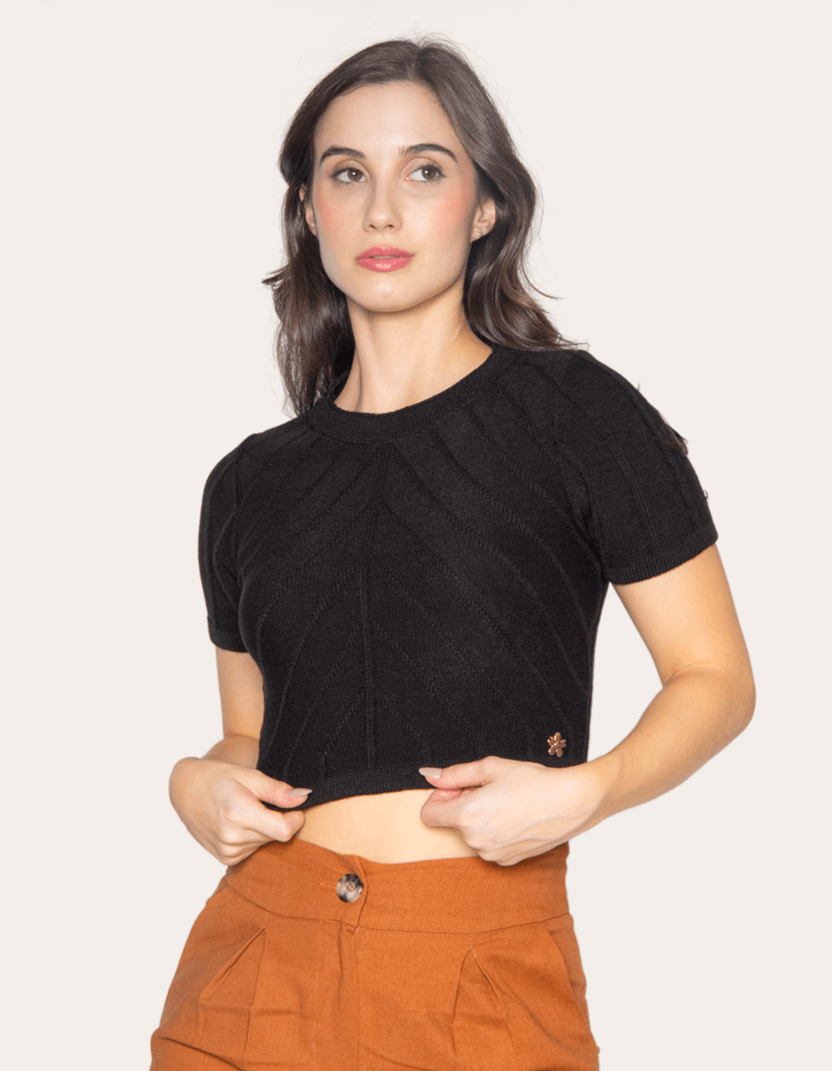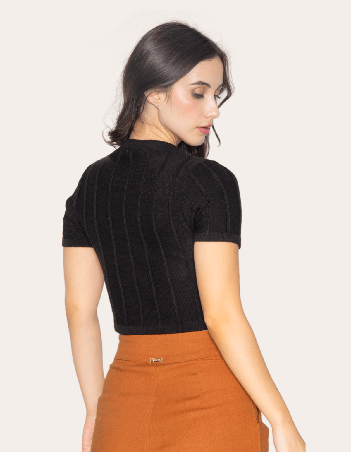 Blusa cropped tricot, manga curta, decote redondo. versátil e prático, a blusa cropped é perfeito para compor looks urbanos e modernos. aposte o top com uma calça jeans wide leg e sandálias flat, você estará pronta e estilosa!