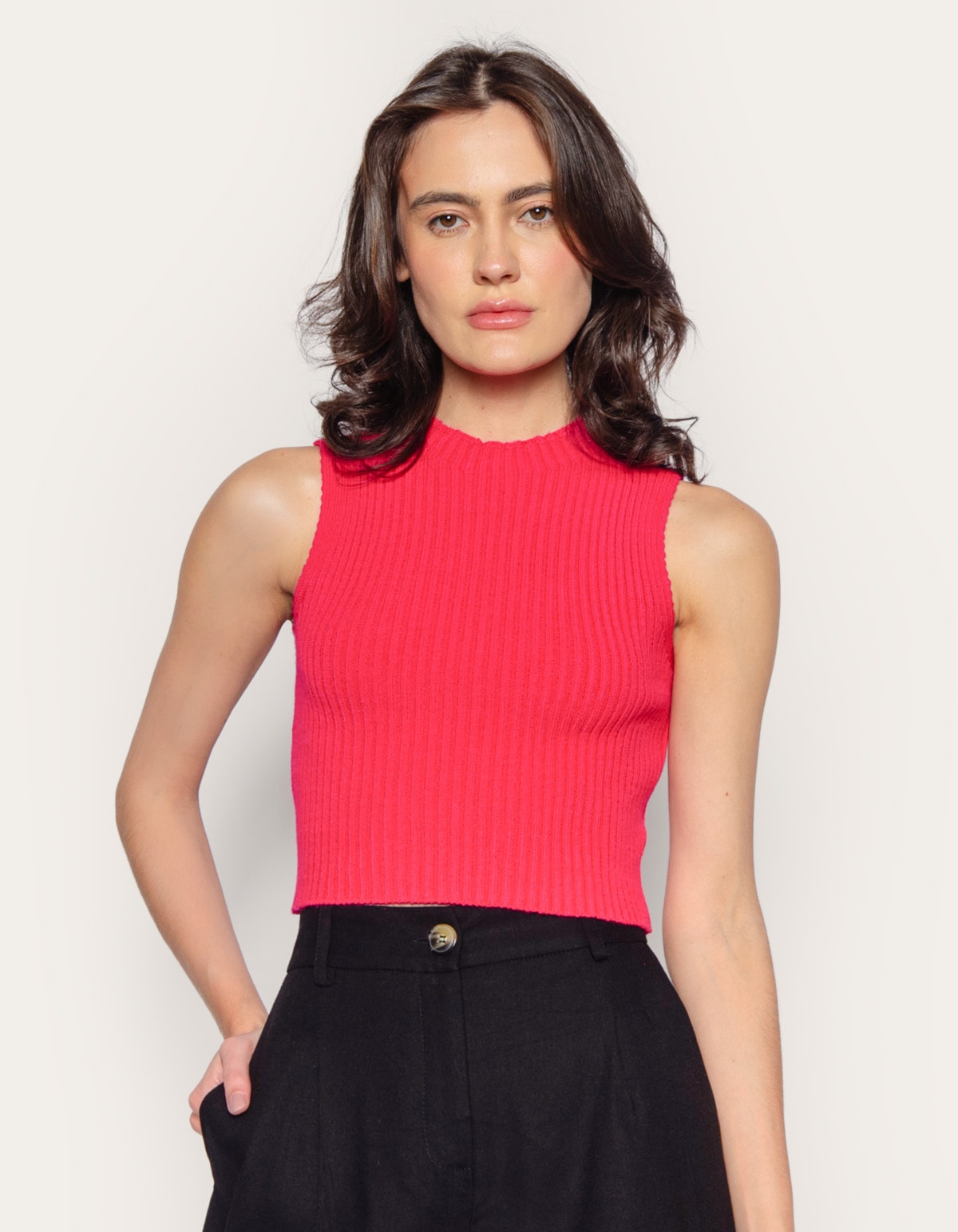 A blusa é confeccionada em tricot canelada. sem manga, golinha alta e comprimento curto. ótima opção para usar com peças de cintura alta, peça possui toque macio e confortável.