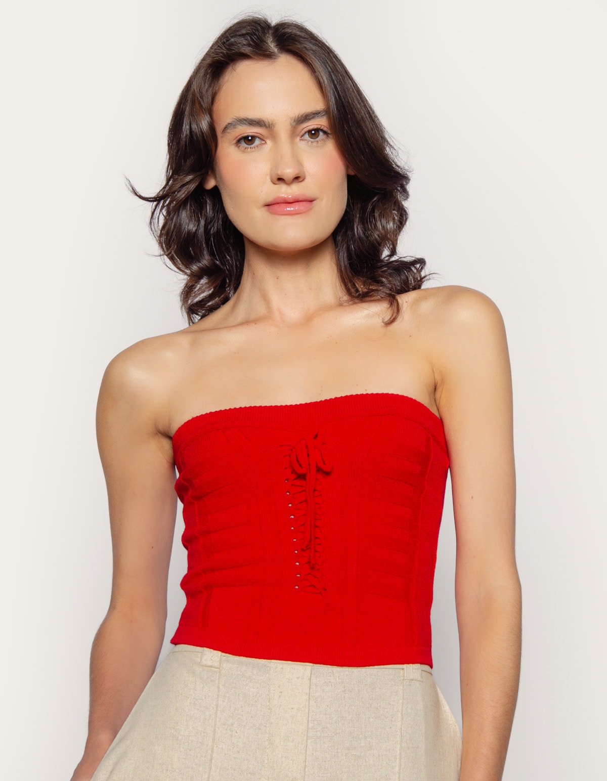 Blusa em tricot, modelagem cropped, tomara que caia corselet com amarração frontal que valoriza a peça. modelo perfeito para valorizar sua silhueta.