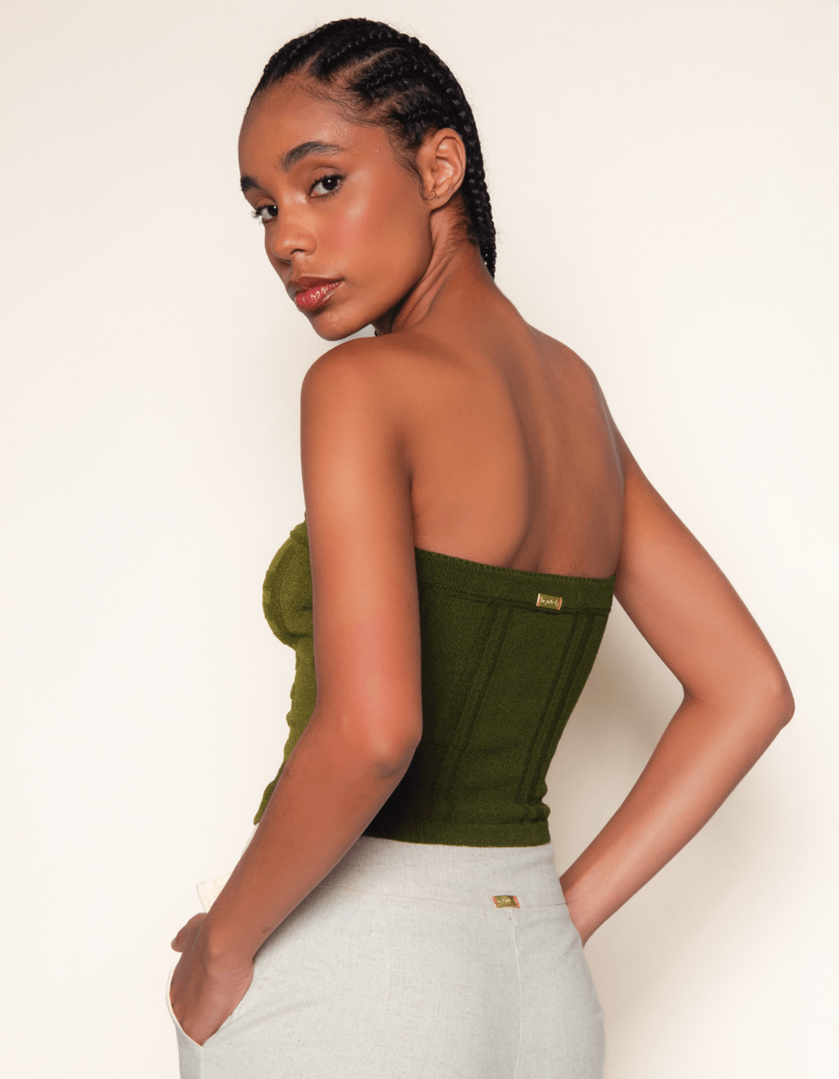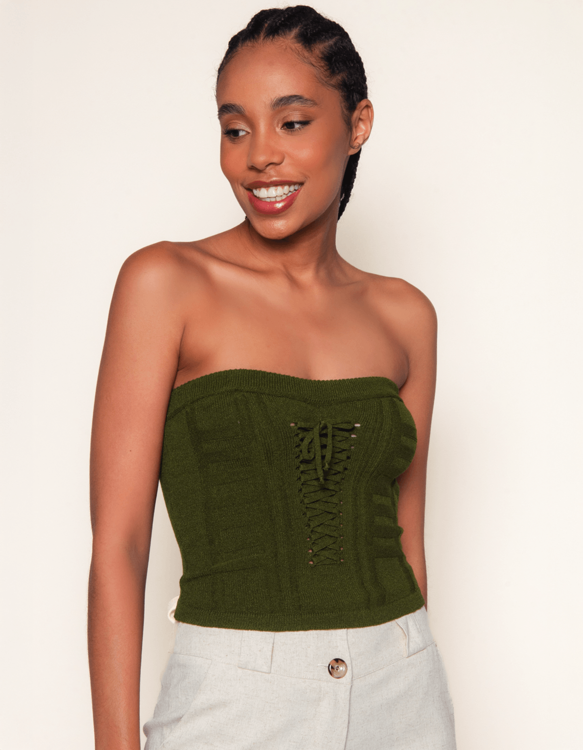 Blusa em tricot, modelagem cropped, tomara que caia corselet com amarração frontal que valoriza a peça. modelo perfeito para valorizar sua silhueta.