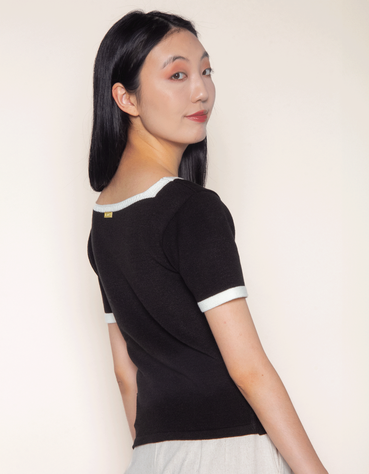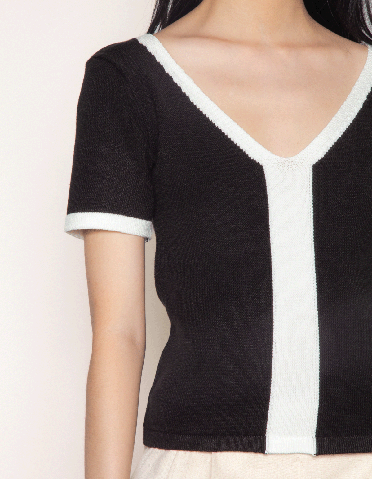 Blusa cropped manga curta confeccionada em tricot, possui detalhe bicolor, decote v e mangas curtas. as peças com combinações de cores garantem visuais harmônicos e contemporâneos, elevando qualquer look com um toque de sofisticação.