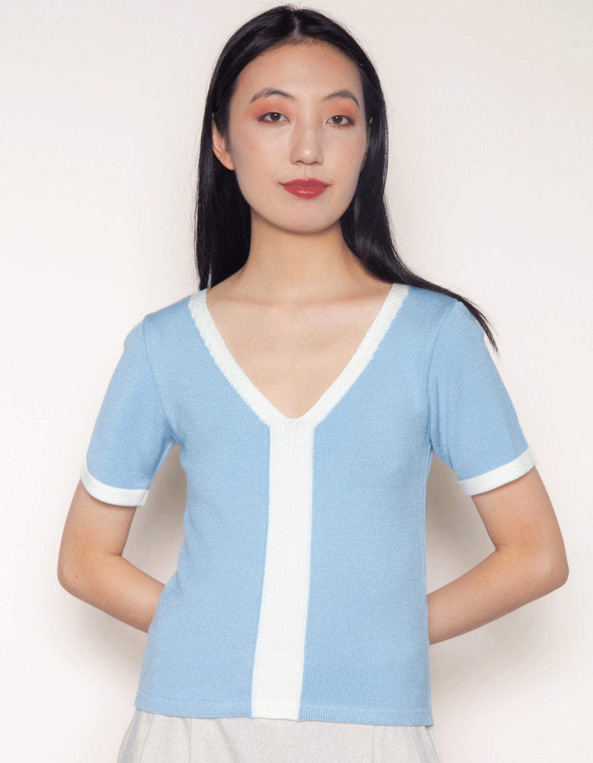 Blusa cropped manga curta confeccionada em tricot, possui detalhe bicolor, decote v e mangas curtas. as peças com combinações de cores garantem visuais harmônicos e contemporâneos, elevando qualquer look com um toque de sofisticação.