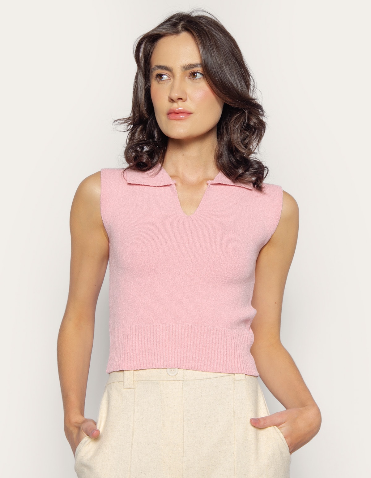Feita de tricot, a peça possui gola polo, é cavada e tem ótimo caimento . combine com uma calça reta de alfaiataria e arrase!