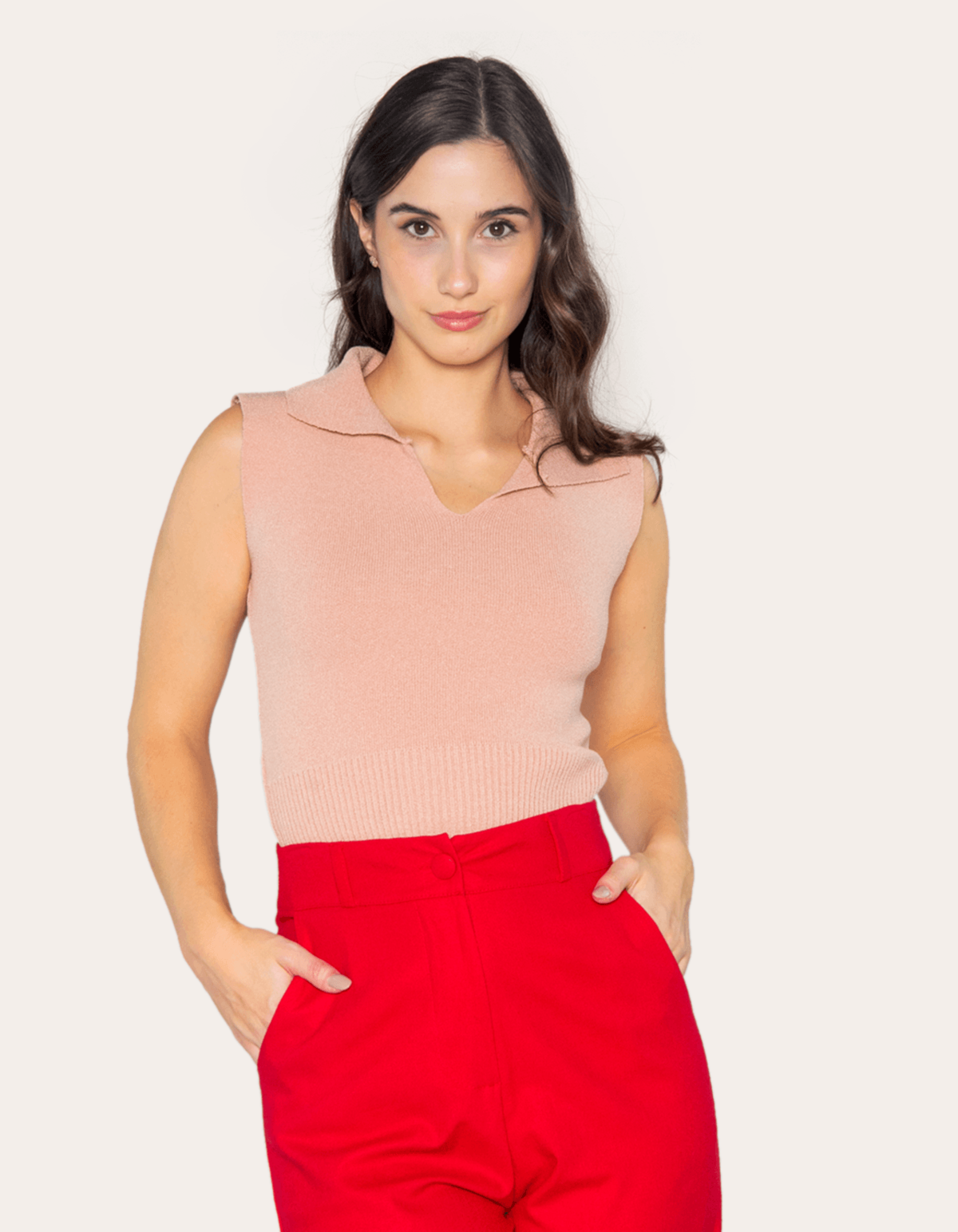 Feita de tricot, a peça possui gola polo, é cavada e tem ótimo caimento . combine com uma calça reta de alfaiataria e arrase!