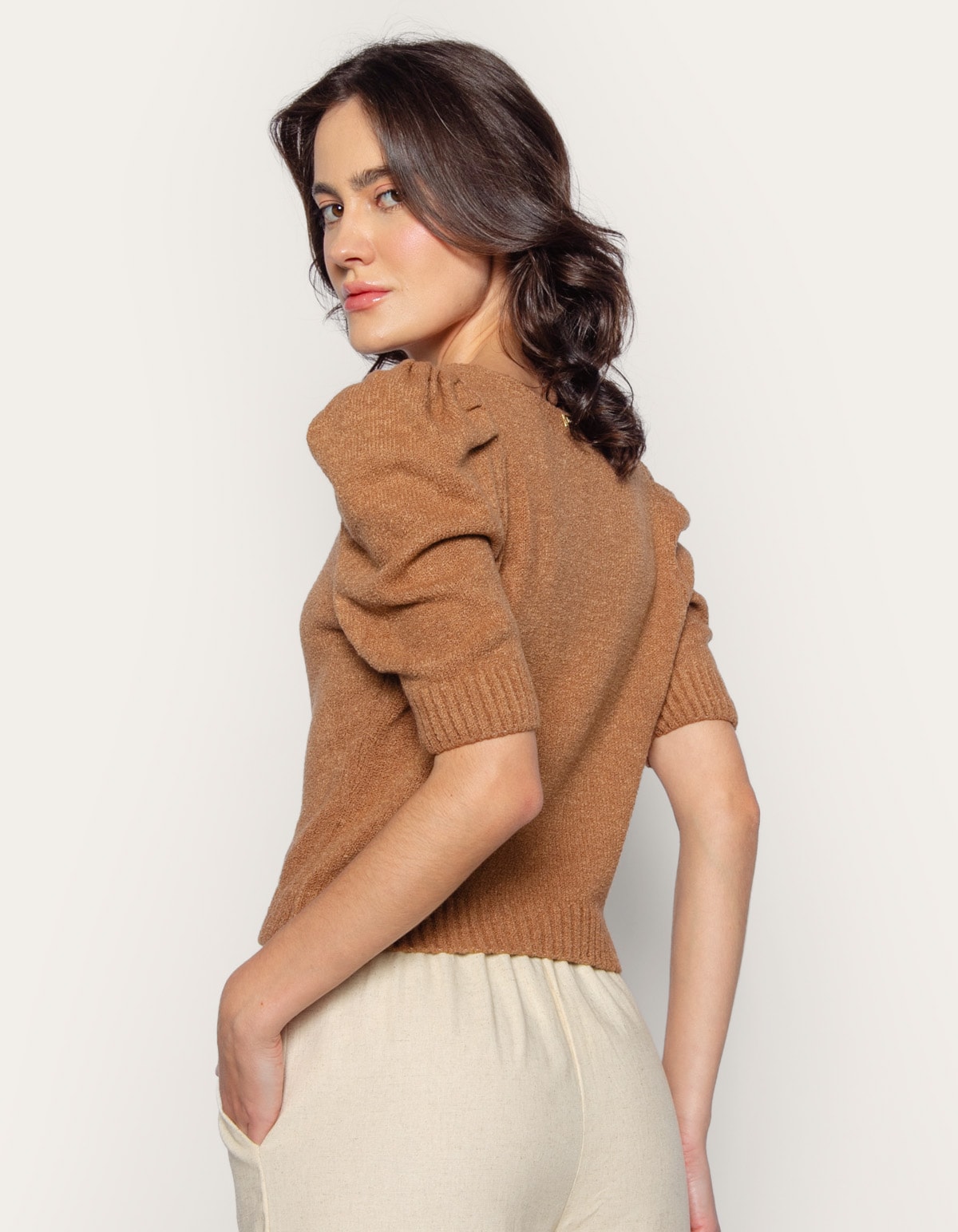 Blusa cropped tricot manga princesa, decote v. clássica e atemporal, ela vai te acompanhar em diversos momentos!