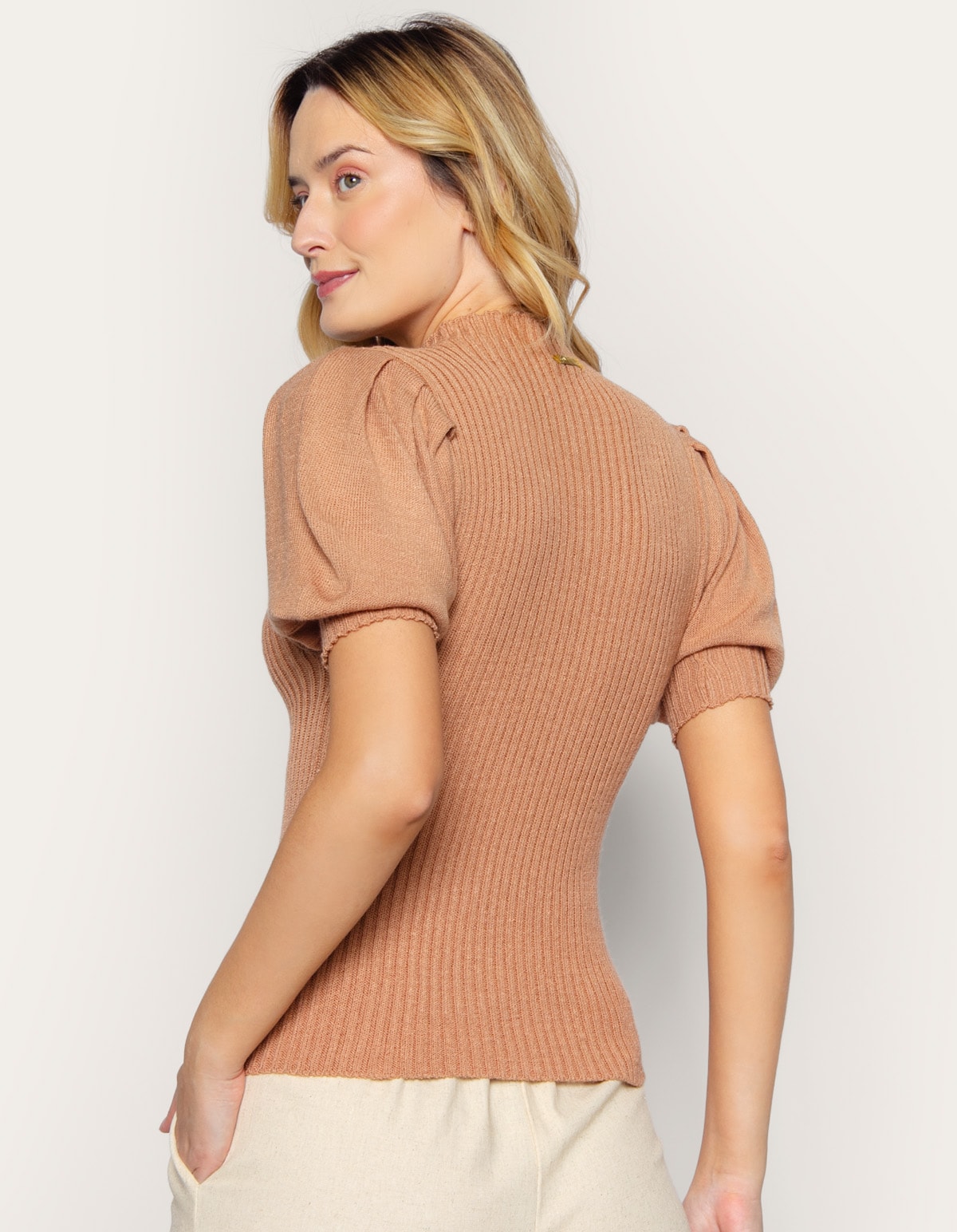 Blusa cropped tricot manga princesa Bege medio
