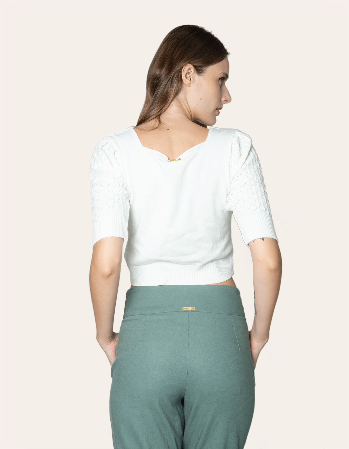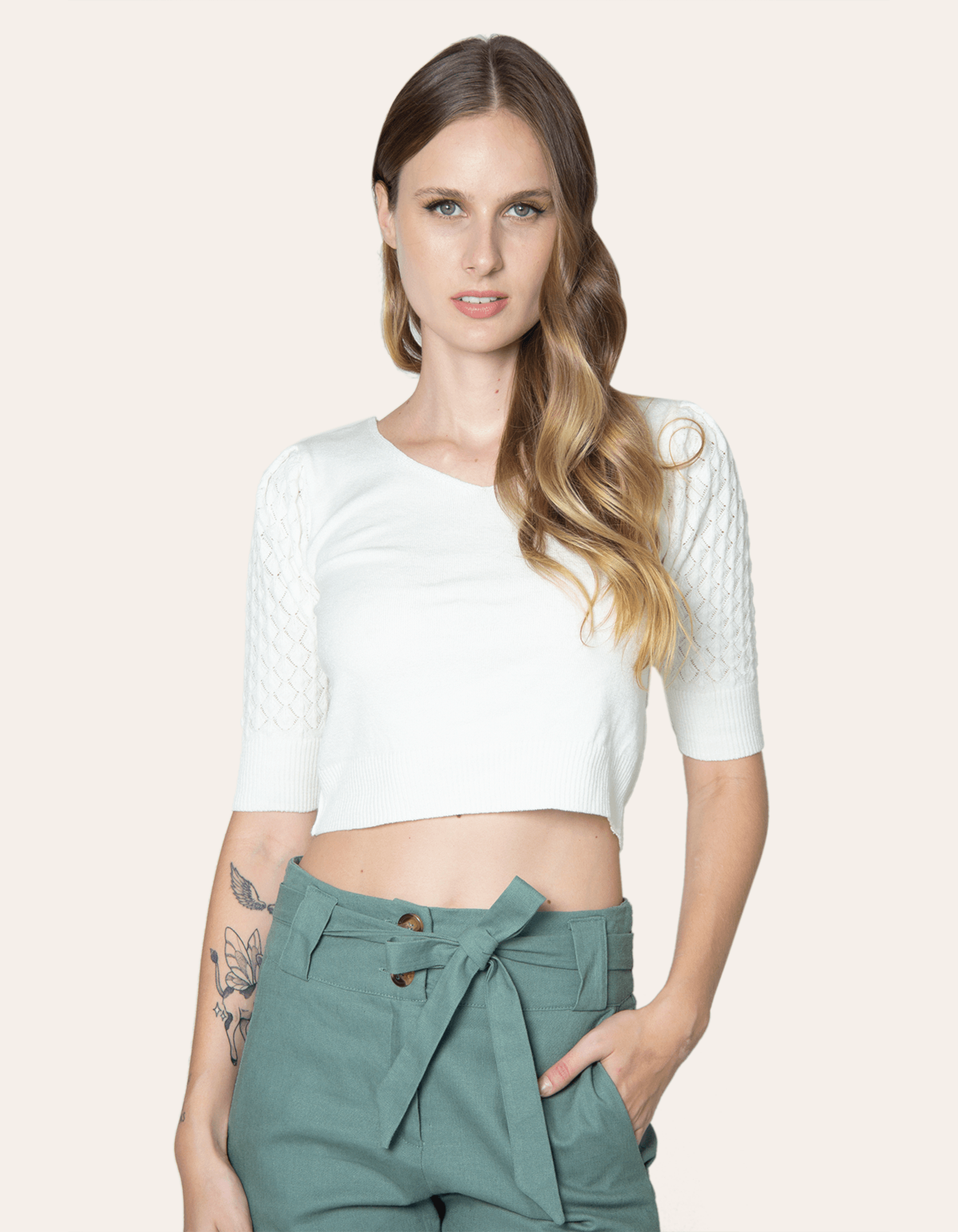 Blusa cropped tricot, decote v, manga curta em ponto rendado. perfeita para arrasar!!