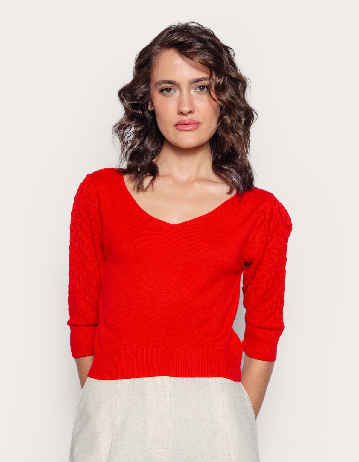 Blusa cropped tricot, decote v, manga curta em ponto rendado. perfeita para arrasar!!
