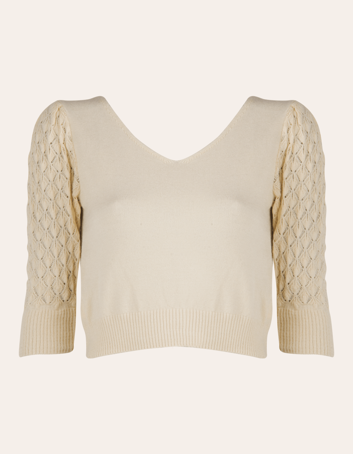 Blusa cropped tricot, decote v, manga curta em ponto rendado. perfeita para arrasar!!