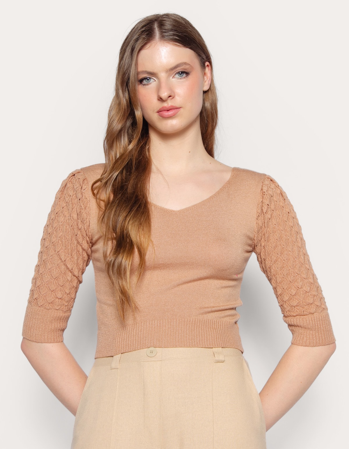 Blusa cropped tricot, decote v, manga curta em ponto rendado. perfeita para arrasar!!