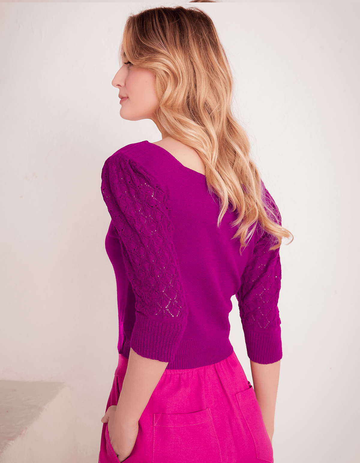 Blusa cropped tricot, decote v, manga curta em ponto rendado. perfeita para arrasar!!