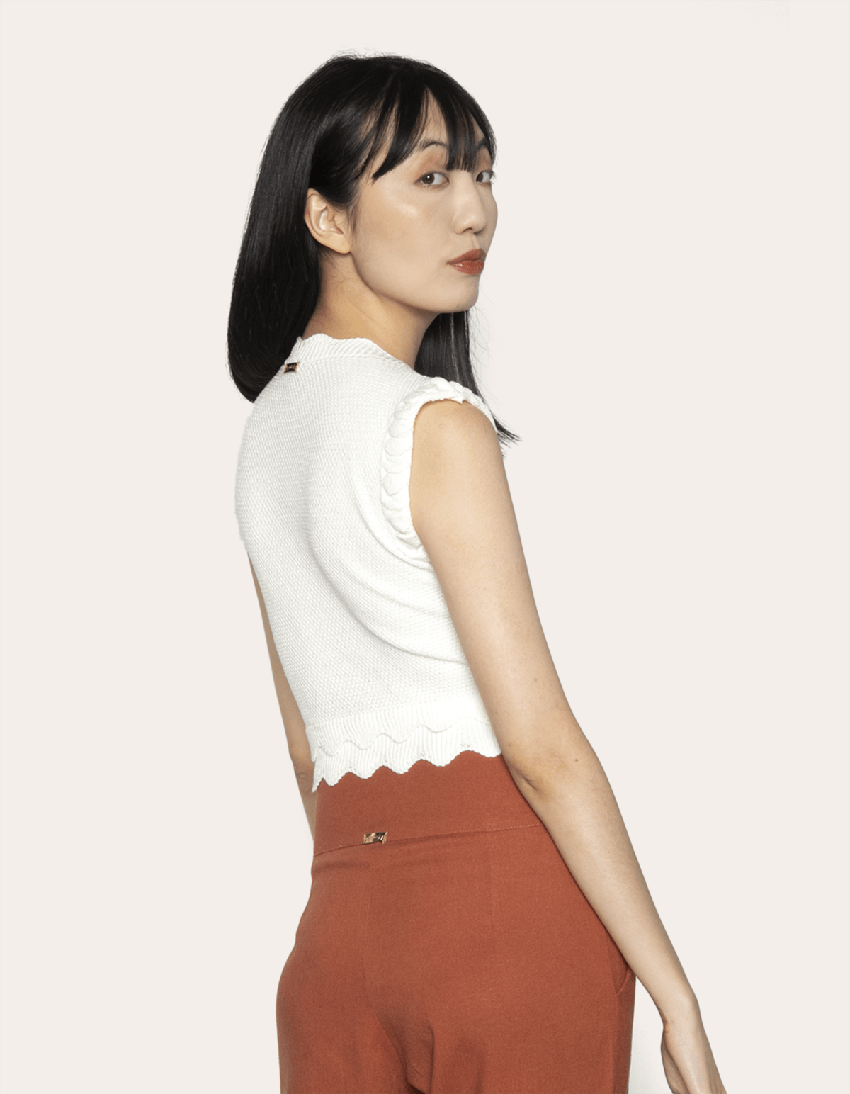 Blus cropped cavada barra e alças com desenho de ondinhas, uma peça que une a beleza do tricot com o charme da barra ondulada. foi cuidadosamente desenvolvida para mulheres que desejam expressar seu estilo único através de detalhes elegantes. é confeccionada em tricot de alta qualidade, proporcionando uma aparência sofisticada e uma textura envolvente. a barra com design ondinha conferem um toque artístico e romântico.