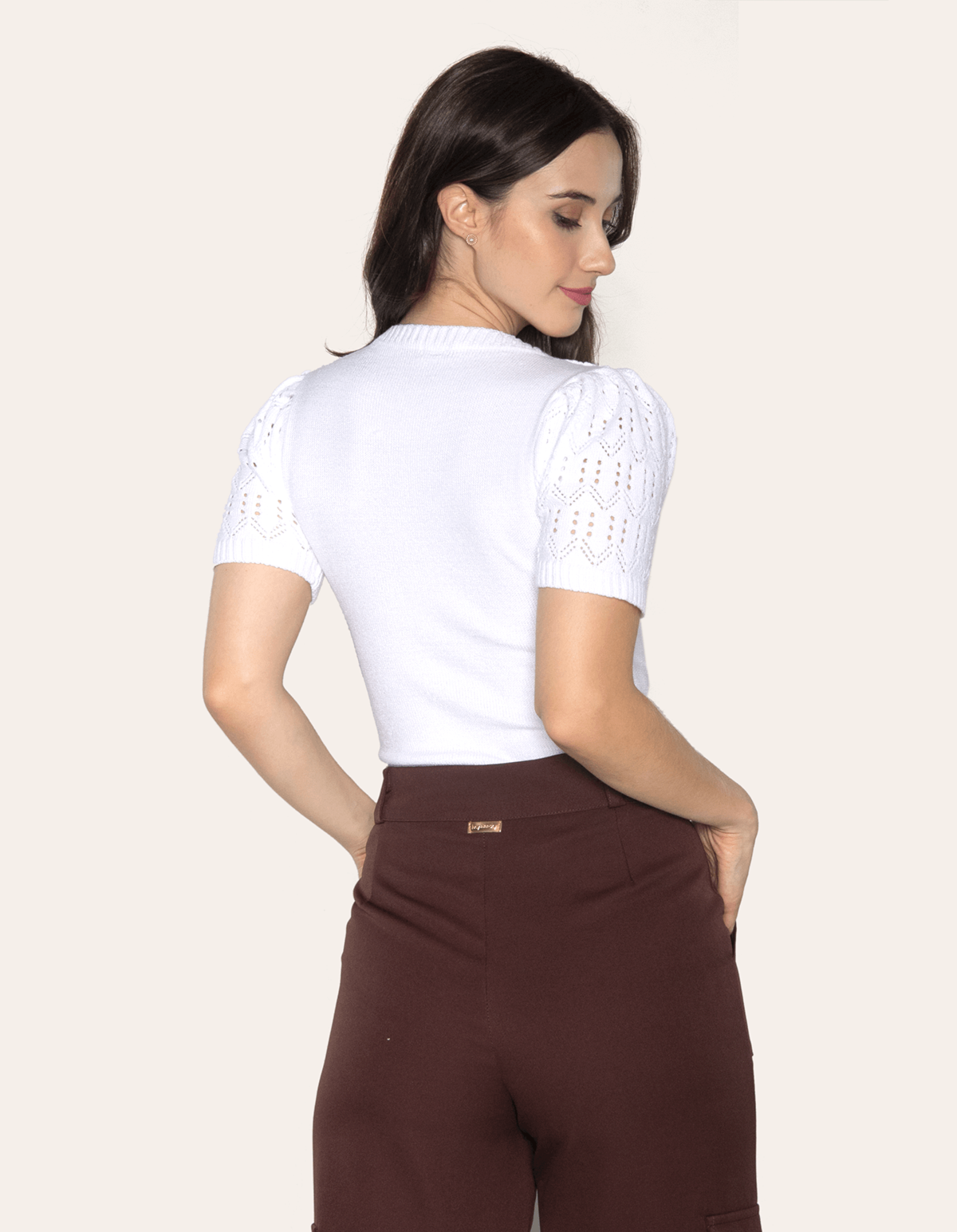 Blusa cropped tricot, manga curta, detalhes vazados, formando um lindo detalhe rendado. uma peça linda, rica em detalhes e traz delicadeza e sofisticação para seu look!