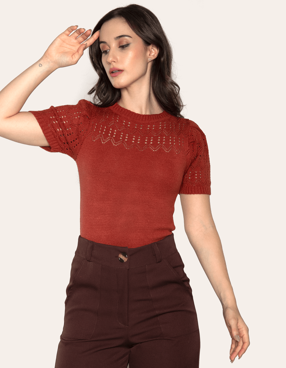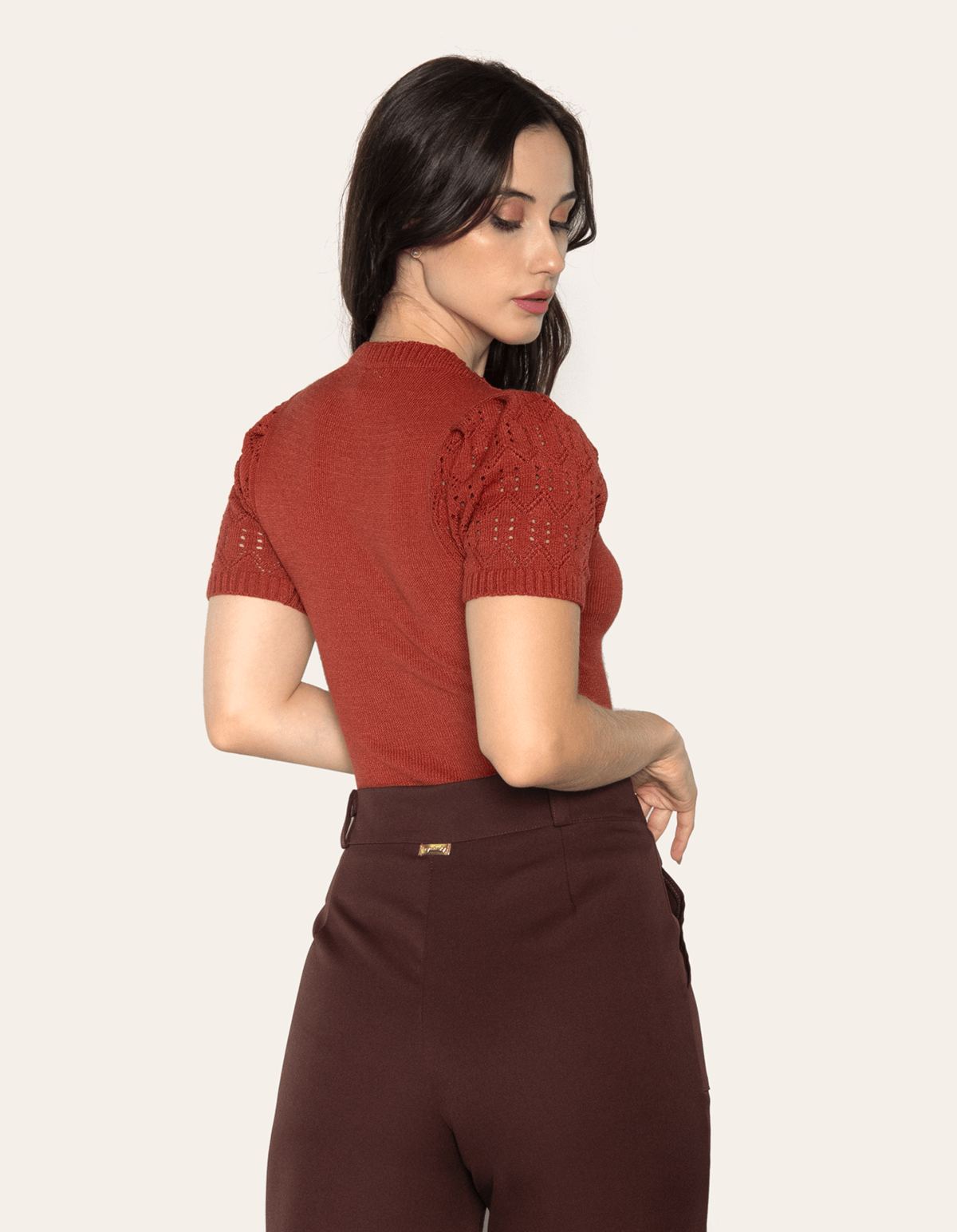 Blusa cropped tricot, manga curta, detalhes vazados, formando um lindo detalhe rendado. uma peça linda, rica em detalhes e traz delicadeza e sofisticação para seu look!