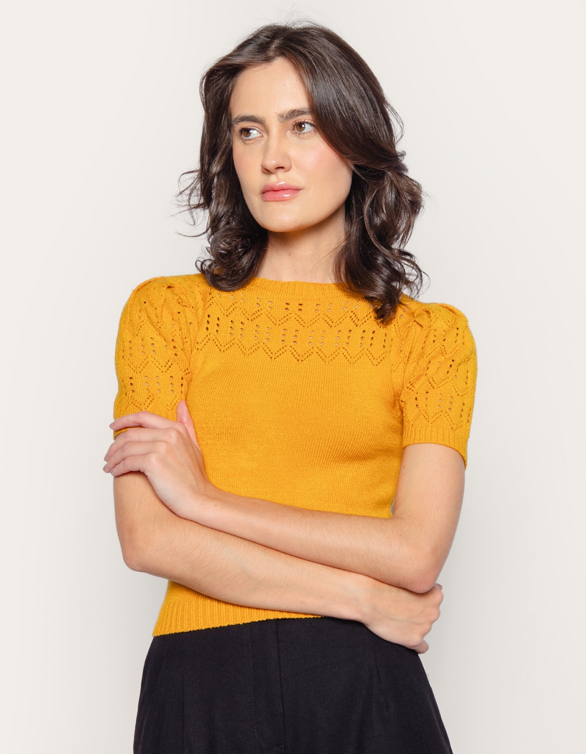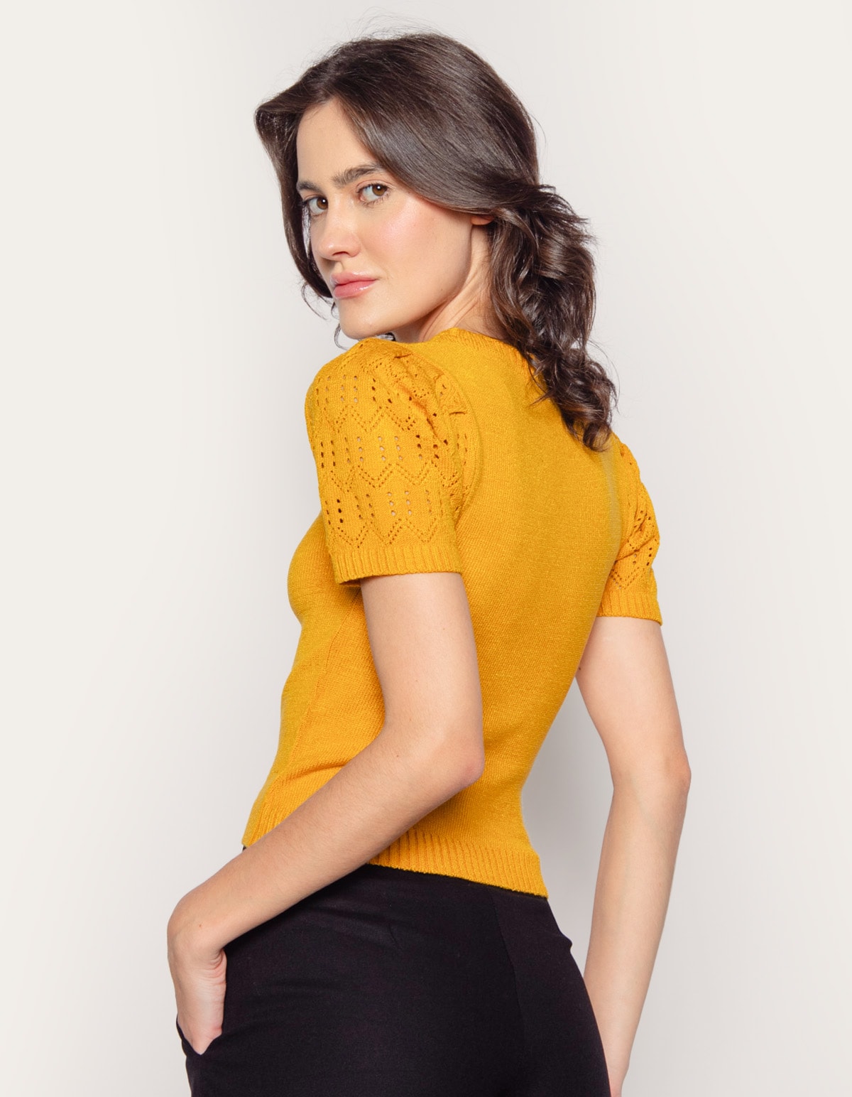 Blusa cropped tricot, manga curta, detalhes vazados, formando um lindo detalhe rendado. uma peça linda, rica em detalhes e traz delicadeza e sofisticação para seu look!