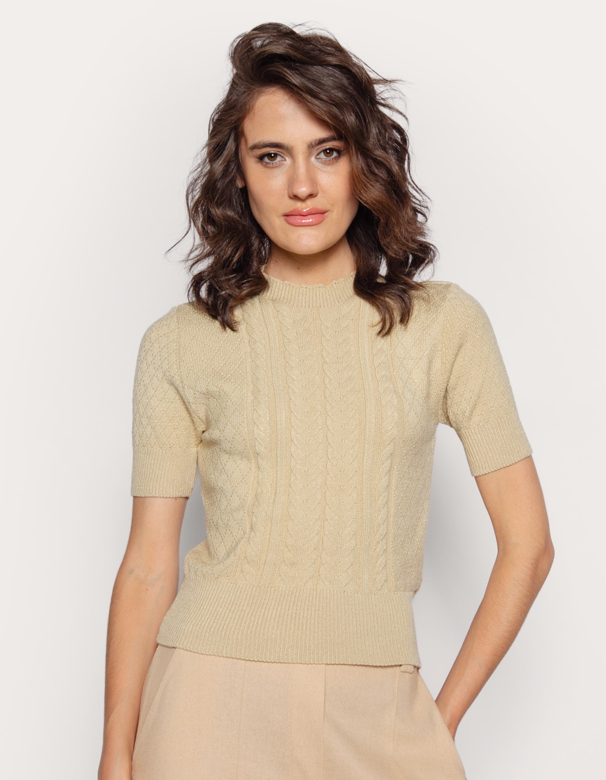 Blusa cropped tricot manga curta, possui golinha média e detalhe trançado na frente. o auge fashion da peça fica todo por conta de suas texturas em relevo. aposte nesse modelo que vloriza a silhueta, é delicada e super versátil para ser usada com saia, calça ou shorts.