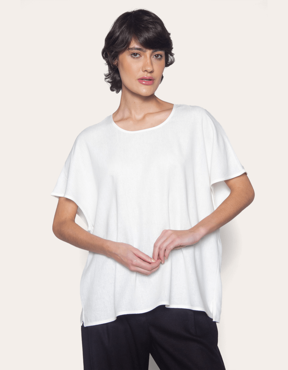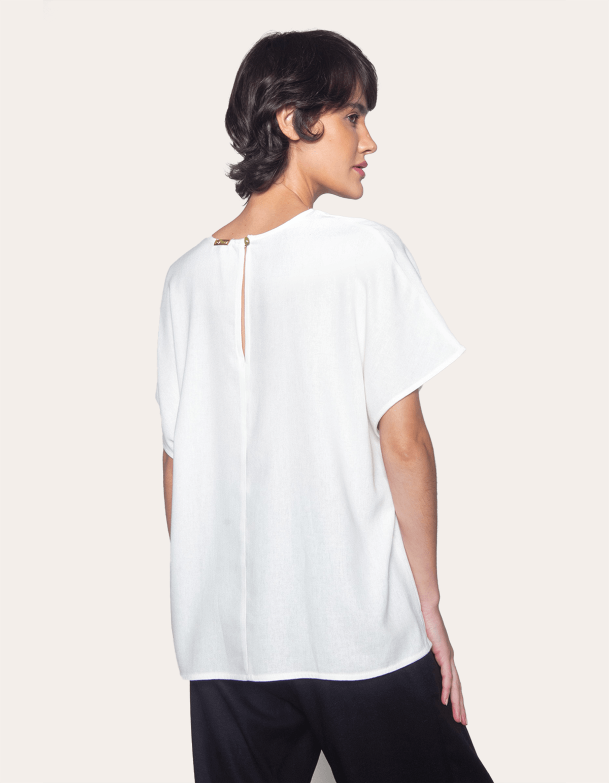 Blusa manga curta ampla, com silhueta soltinha, decote redondo e fecho nas costas com botão, elaborada em tecido de viscose, linho e algodão que garantem frescor e acabamento macio. É ideal para um visual moderno e sofisticado.