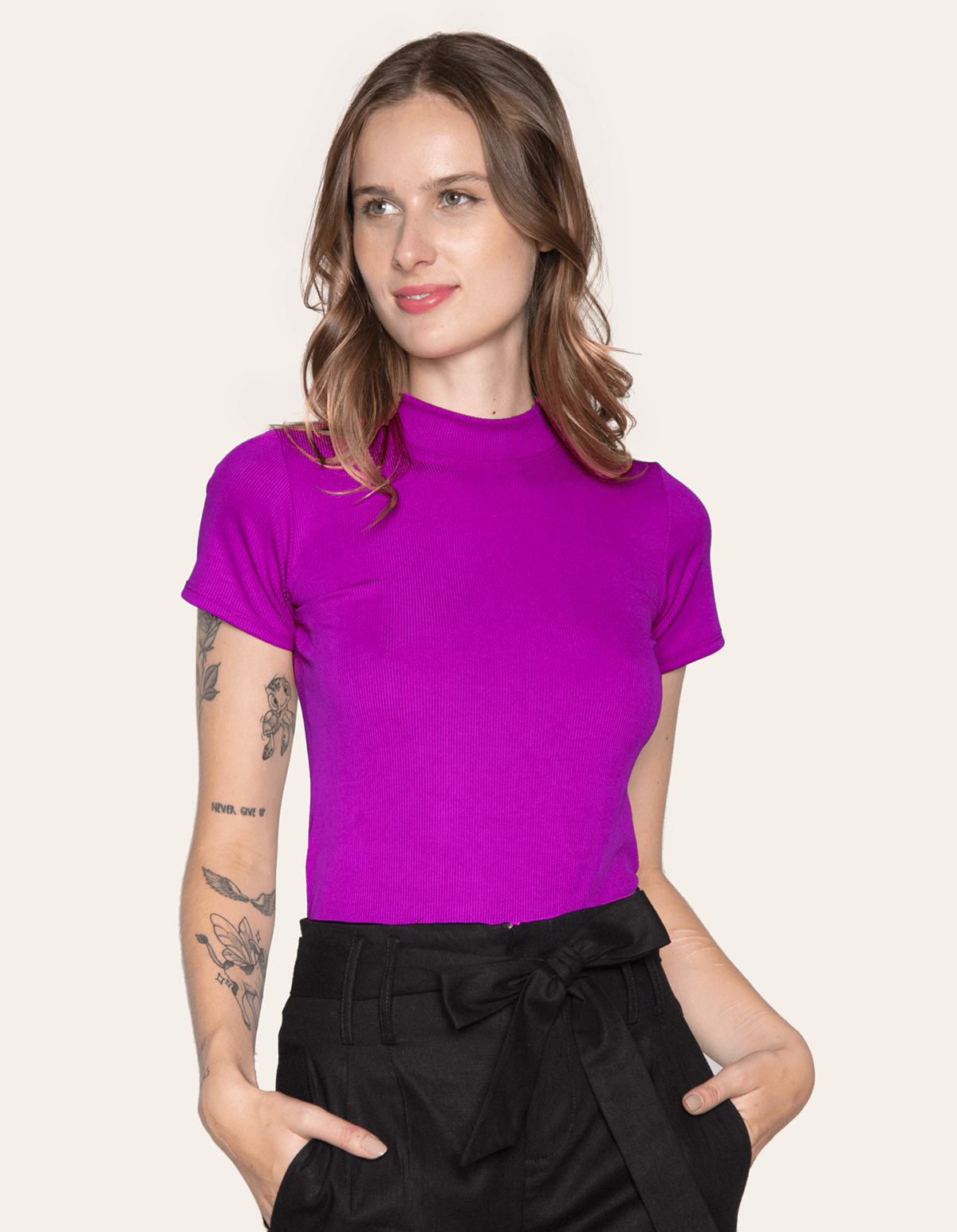 Blusa feminina desenvolvida em malha canelada com elasticidade. o modelo tem caimento ajustado ao corpo. as mangas são curtas e a gola é alta. aquele modelo básico que serve como coringa no guarda-roupa e ainda deixa o look super estiloso, com um fit super elegante.