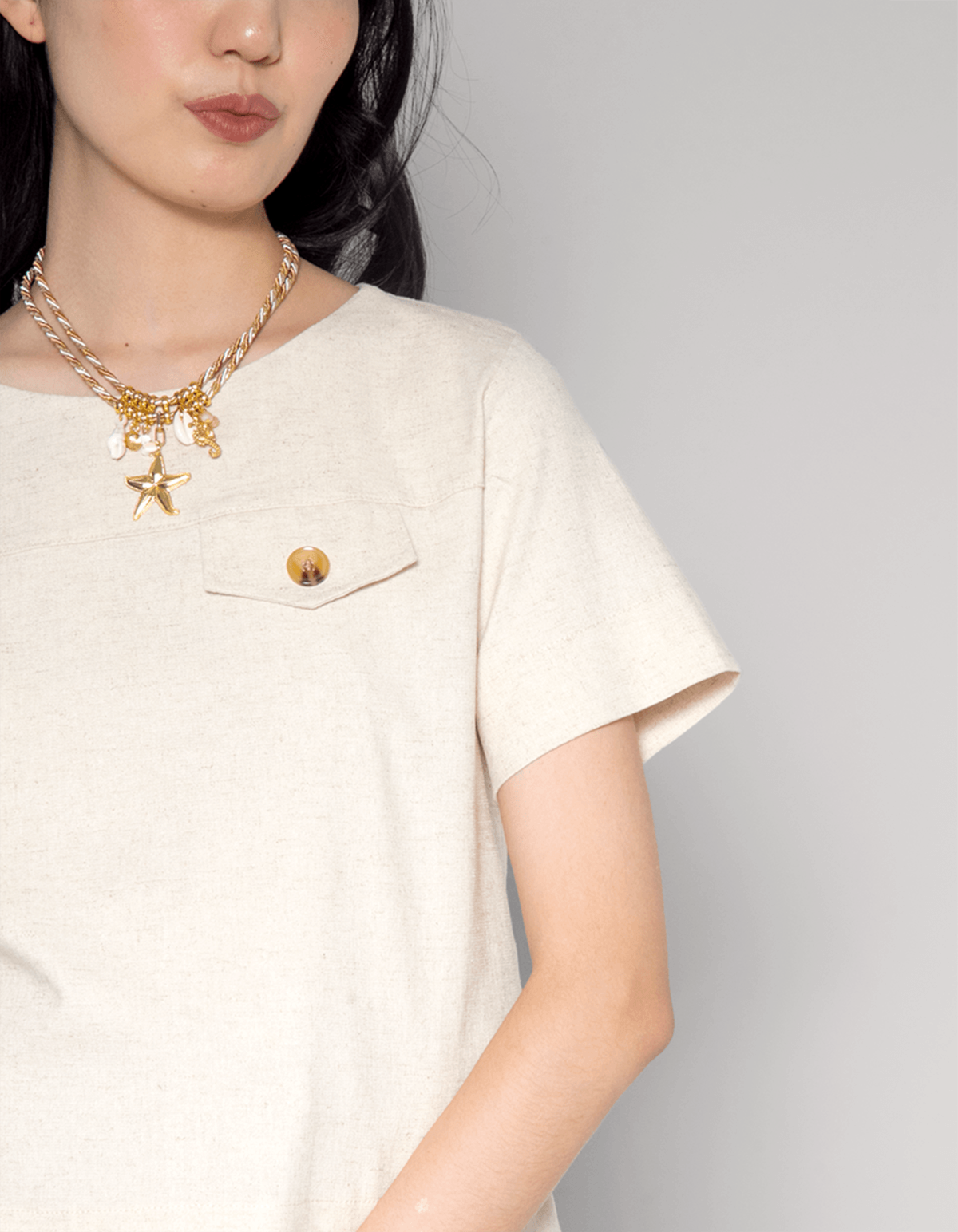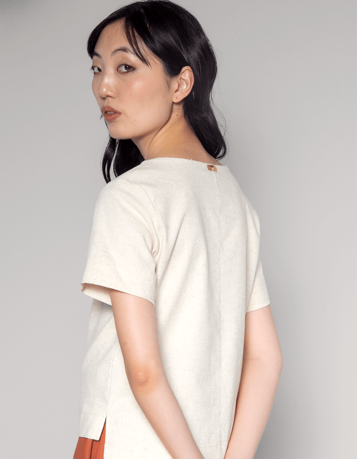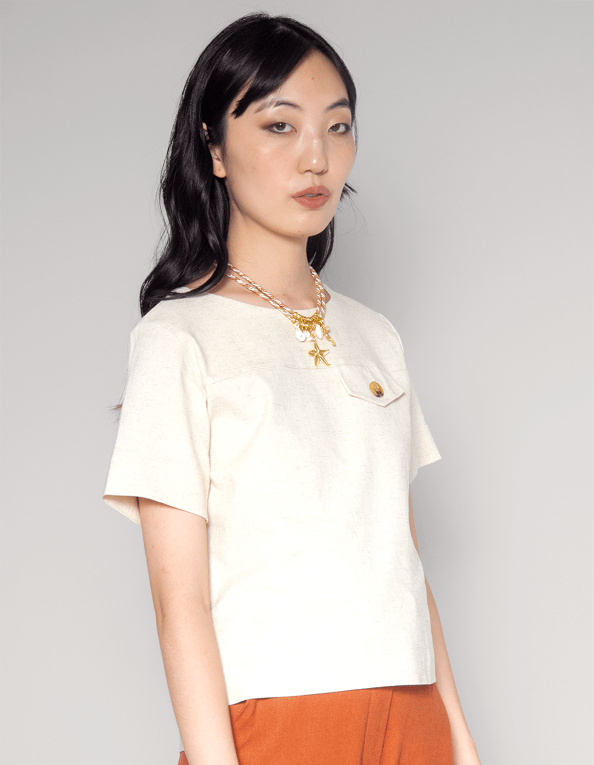 Blusa manga curta, decote redondo, lapela não funcional com botão na frente, barra maior atrás e abertura nas laterais. uma opção versátil e sofisticada para o seu dia a dia.