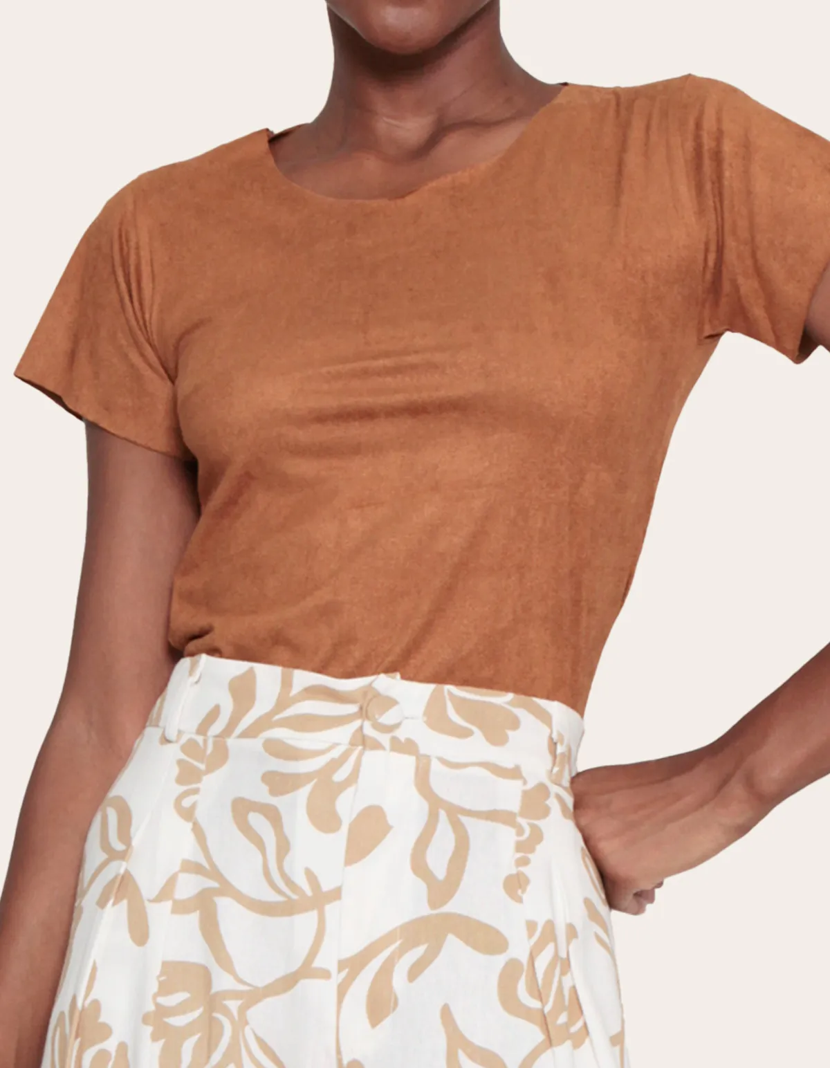 Apresentamos a nova blusa em suede, a favorita da temporada, que une praticidade, sofisticação e conforto. com gola redonda clássica, modelagem reta e mangas curtas, oferece versatilidade para várias ocasiões. seus acabamentos corte a fio trazem modernidade, enquanto o toque macio do suede adiciona luxo. uma peça única para looks que combinam elegância e descontração, perfeita tanto para compromissos casuais quanto eventos refinados.
