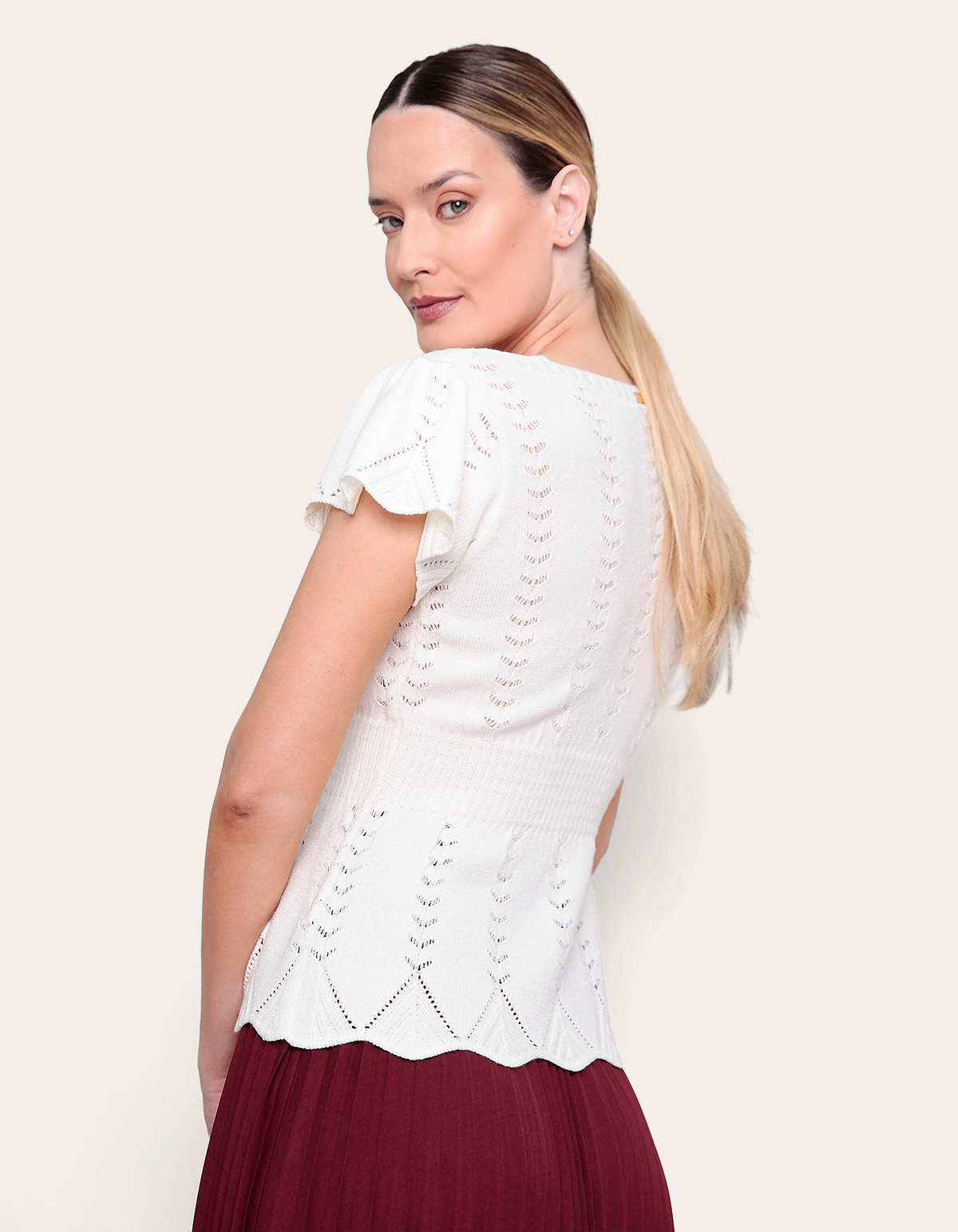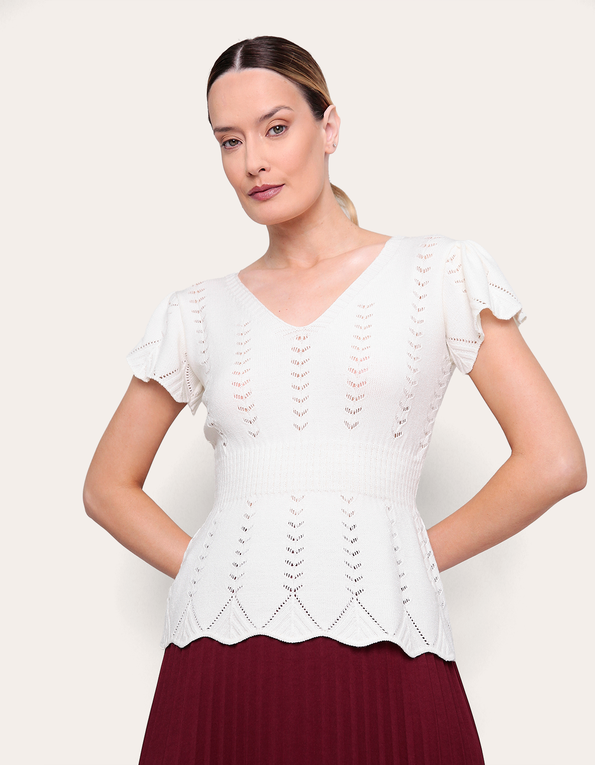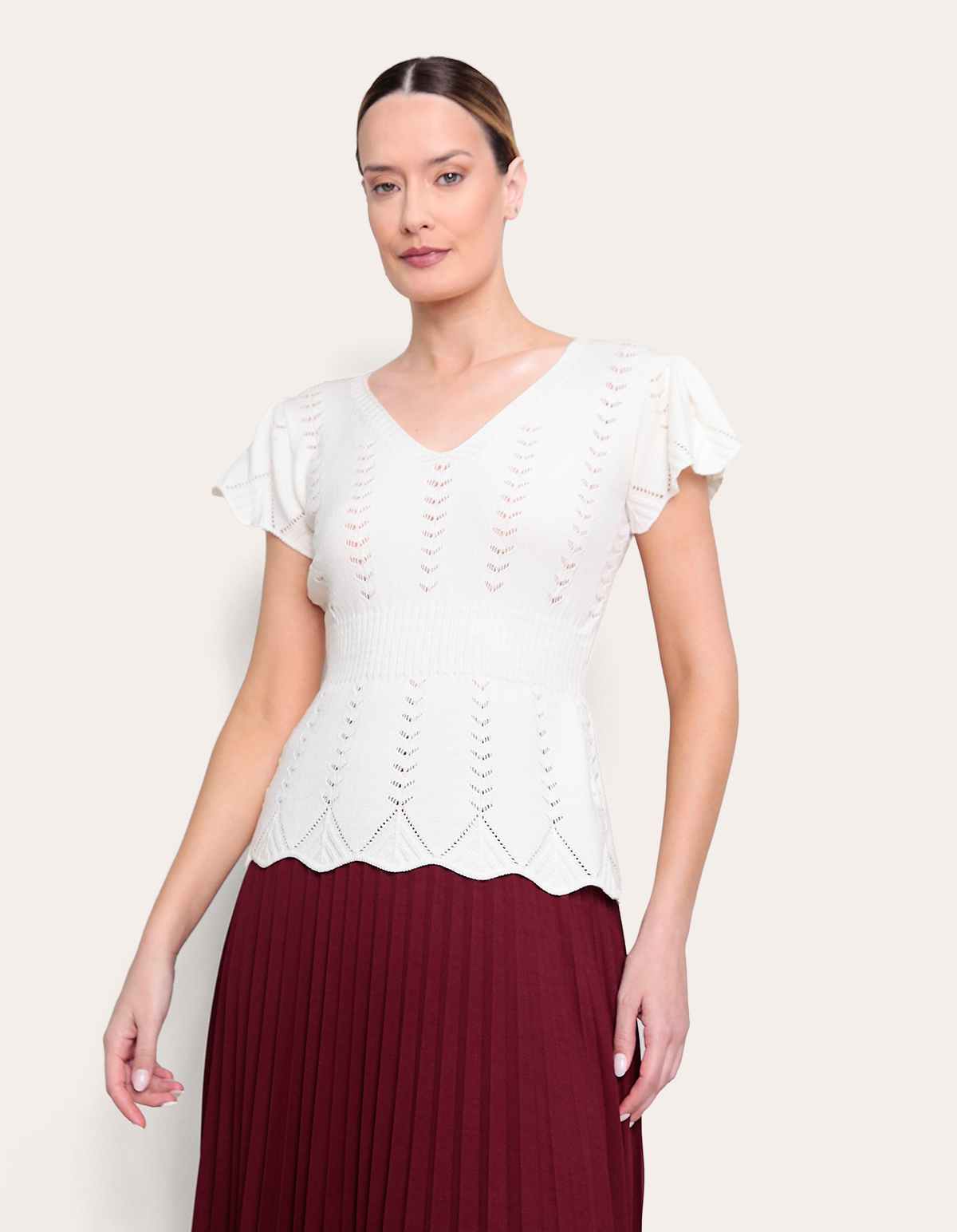uma opção comfy chic para a meia-estação. com decote v e acabamento em babado, a peça em tricot leve empresta um toque vintage aos looks. combine com a saia plissada para um visual romântico e sofisticado.