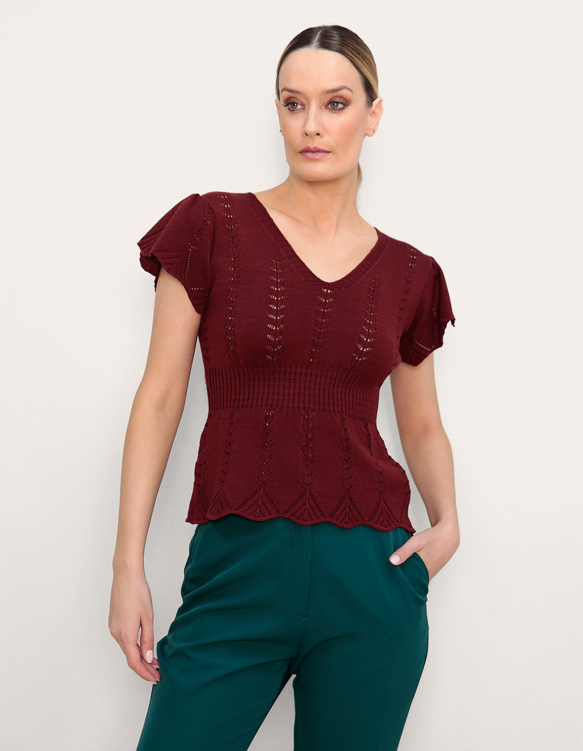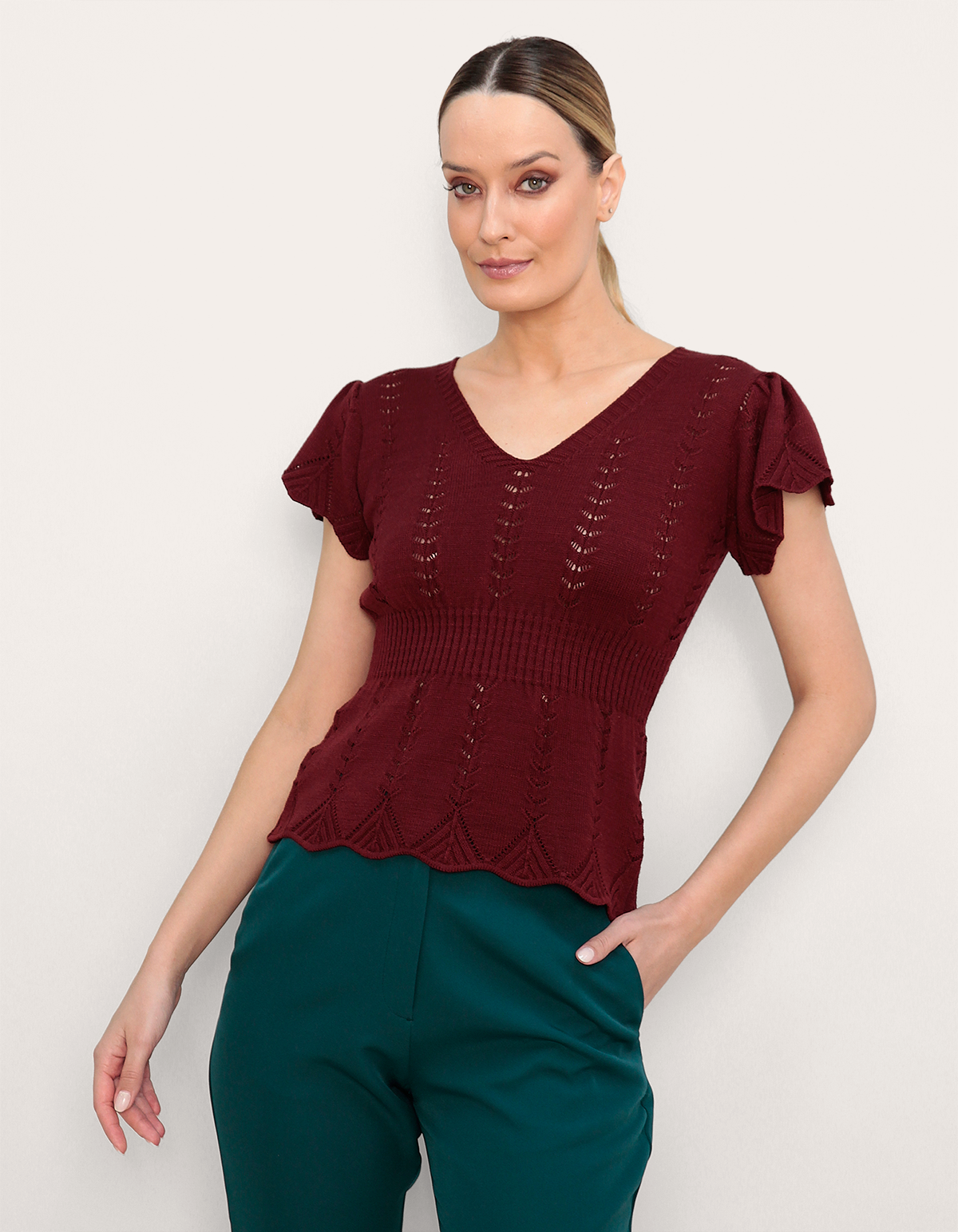 uma opção comfy chic para a meia-estação. com decote v e acabamento em babado, a peça em tricot leve empresta um toque vintage aos looks. combine com a saia plissada para um visual romântico e sofisticado.